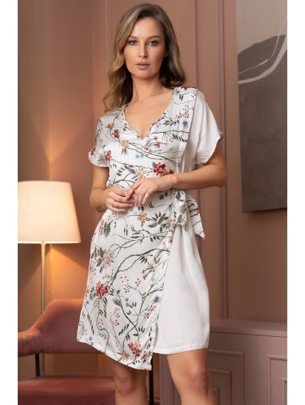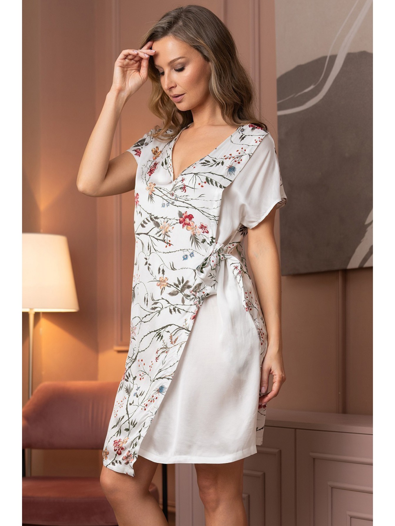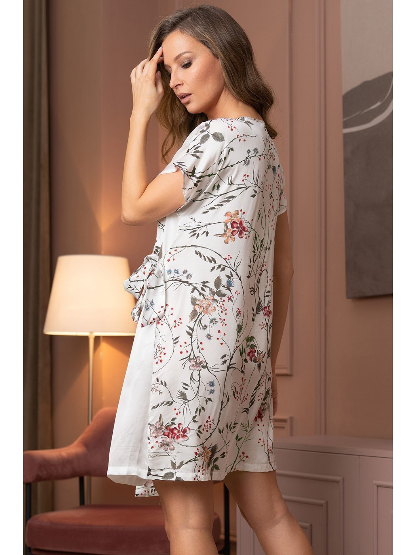 Туника Mia-Amore свободного силуэта длиной чуть выше колен с коротким рукавом. Изделие выполнено из принтованного смесового шелка с однотонной отделкой. Ширину туники можно регулировать за счет пояса расположенного на уровне талии. В боковых швах обработаны карманы.