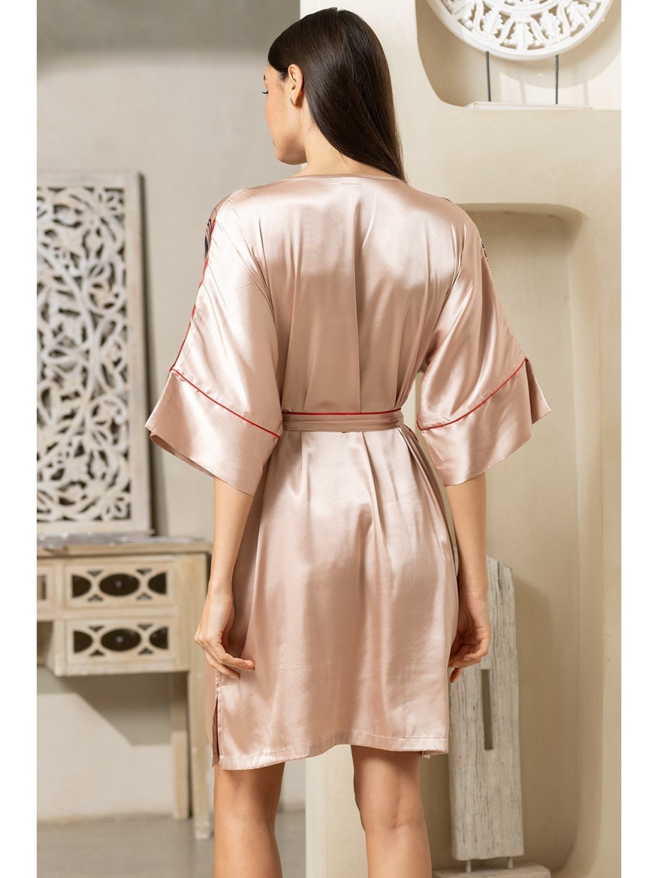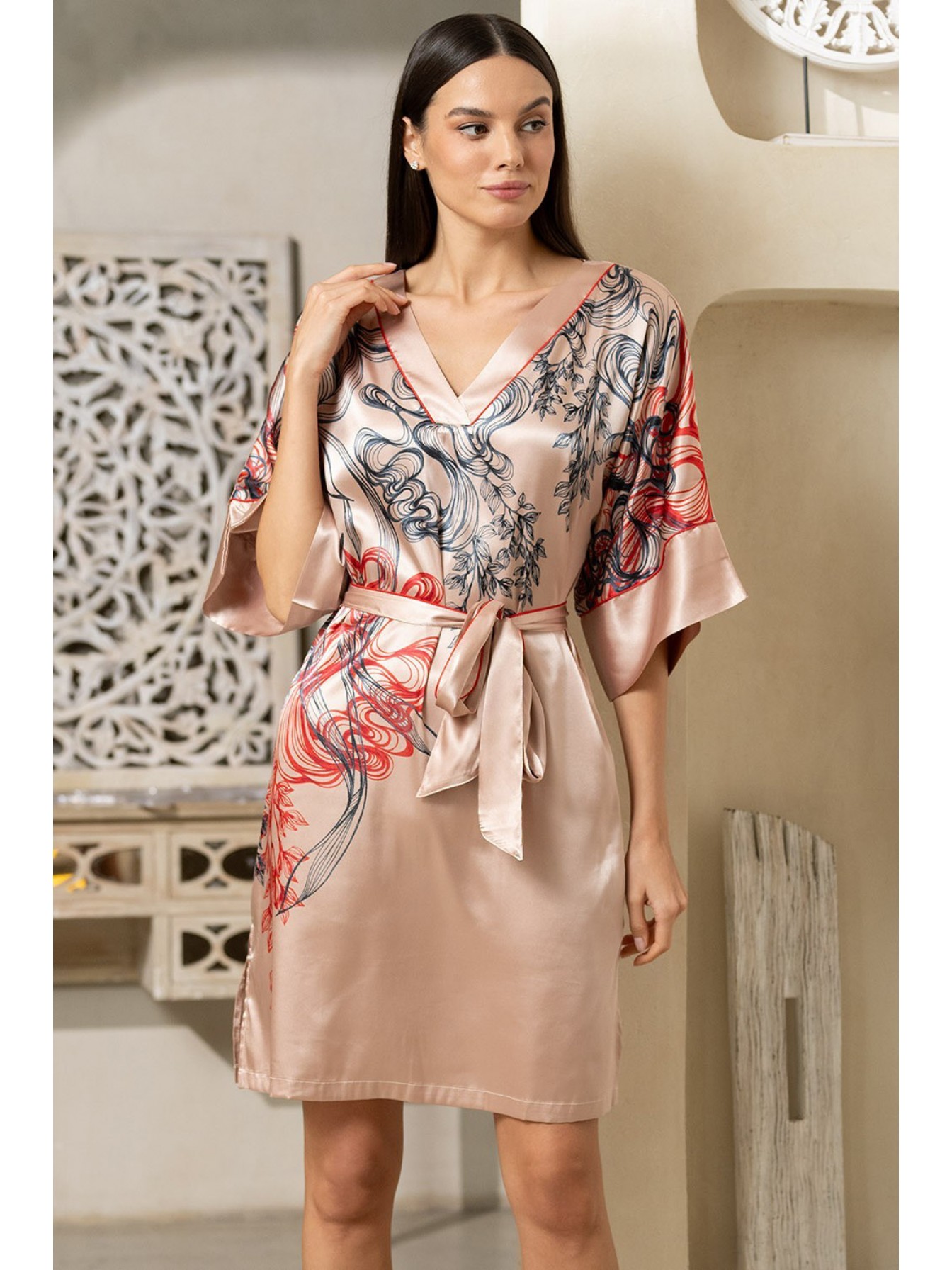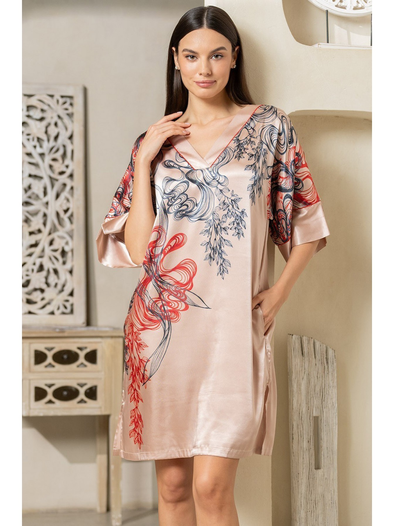 Короткая туника Mia-Amore свободно силуэта с широким рукавом, которая выполнена из искусственного шелка с монопринтом, расположенным на полочке и контрастным кантом в виде отделки. В боковых швах расположены карманы, по низу туники обработаны разрезы. Линию талии можно подчеркнуть за счет пояса, который идет в комплекте.