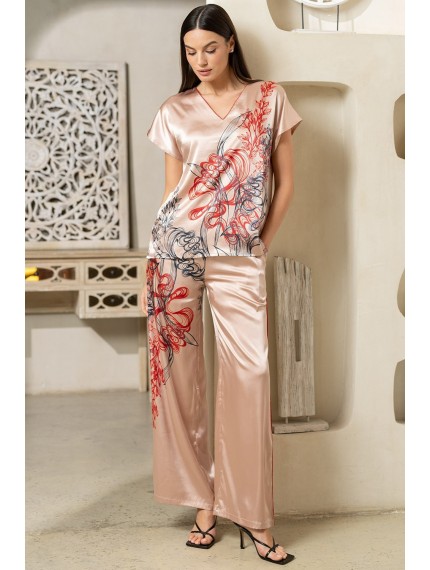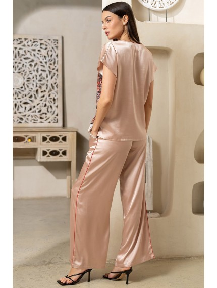 Комплект Mia-Amore состоит из топа с коротким рукавом и широких брюк. Комплект выполнен из искусственного шелка с монопринтом, расположенным на полочке топа и левой части брюк. Контрастный кант расположен по вырезу топа и боковым швам брюк. В боковых швах брюк обработаны карманы.