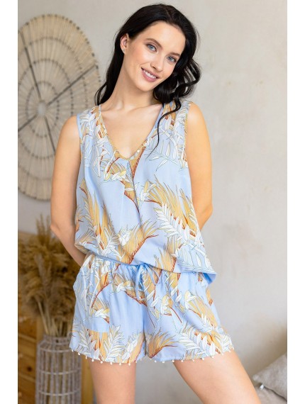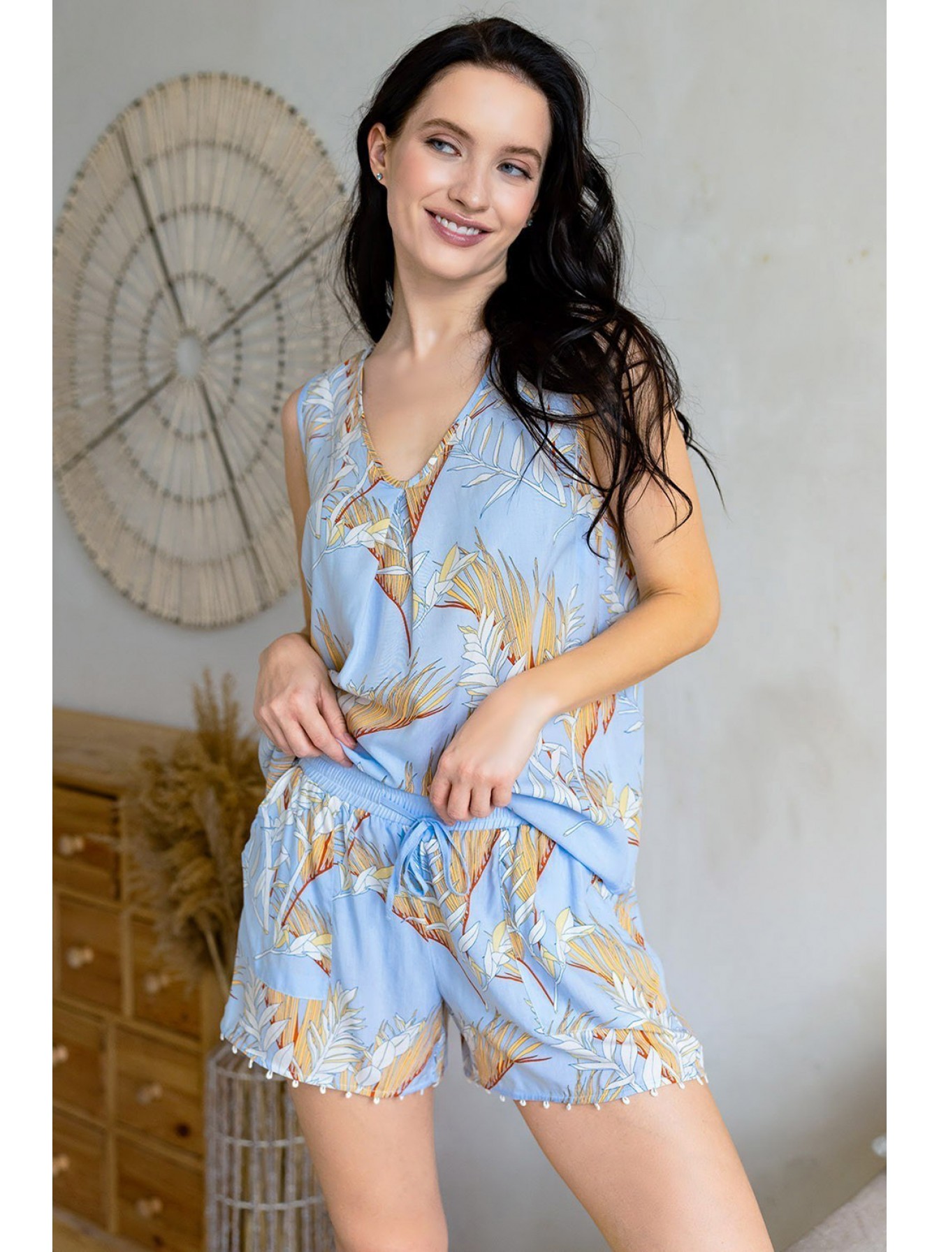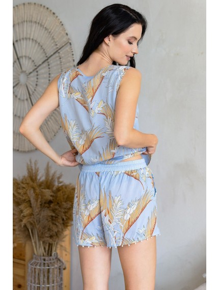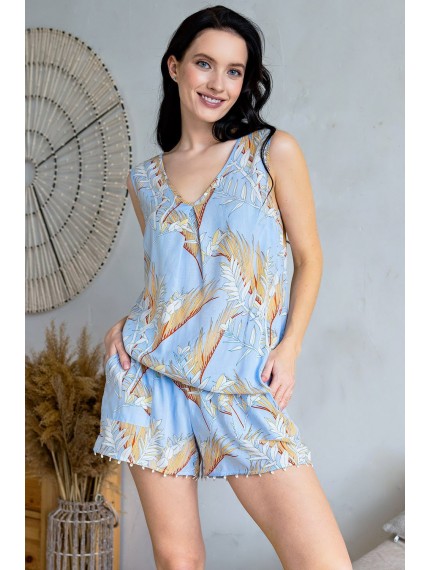 Комплект Mia-Amore состоит из топа на широких бретелях и шорт. Комплект выполнен из тканой принтованной вискозы. Линия низа шорт обработана декоративной тесьмой. По бокам шорт расположены карманы.