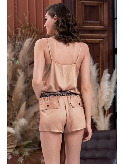 Комплект Mia-Amore состоит из топа на тонких бретелях с центральной застежкой на пуговицы и шорт. Шорты с широким эластичным поясом и кулисой. На передних частях пояса обработаны накладные карманы с декоративным орнаментом по линии входа, а на задних частях расположены декоративные клапаны - имитация карманов. Изделия комплекта выполнены из вискозы c шелком.