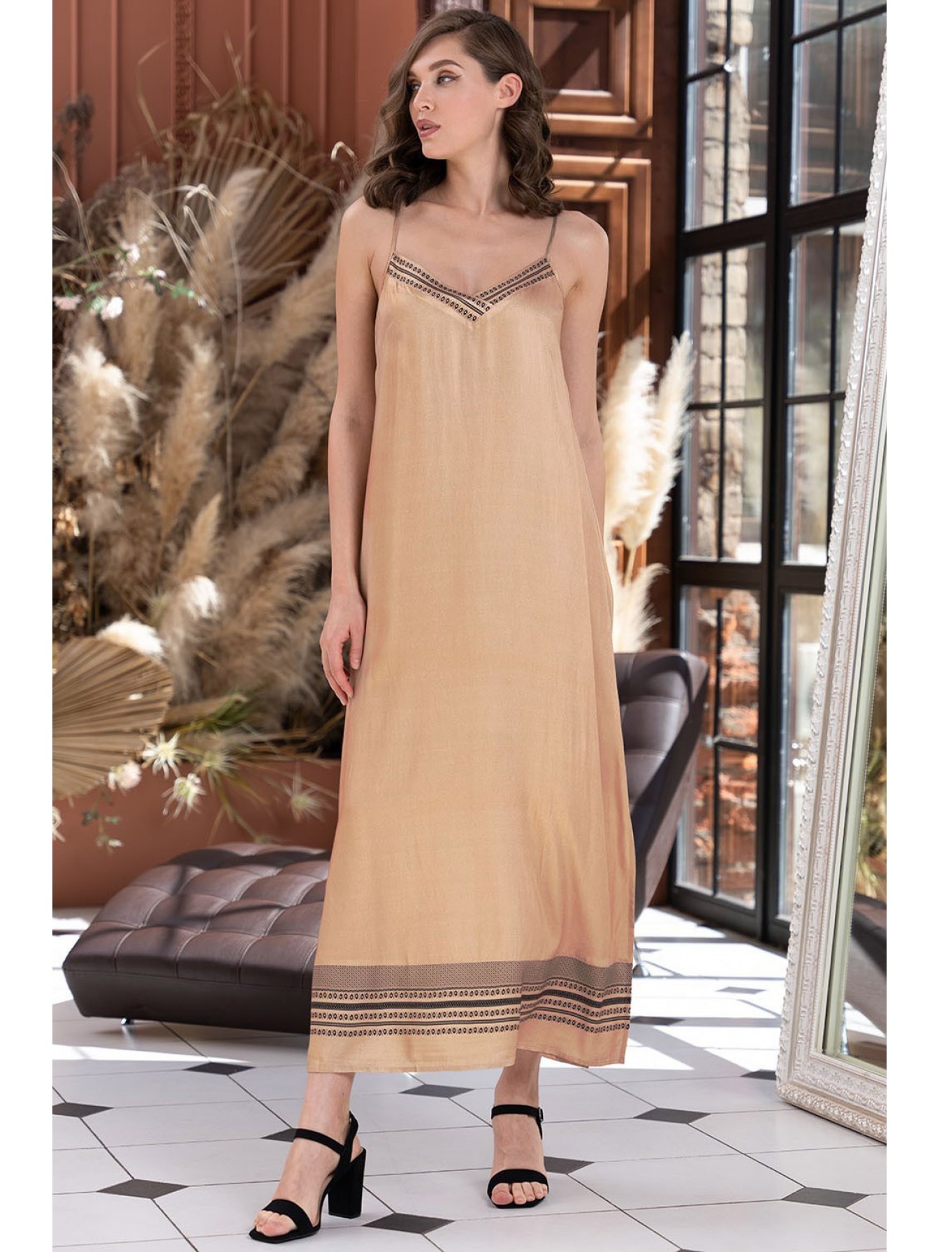 Длинная сорочка Mia-Amore свободного силуэта на тонких бретелях с V-образным вырезом. Декоративный орнамент расположен по вырезу и низу сорочки. По бокам обработаны пикантные разрезы.