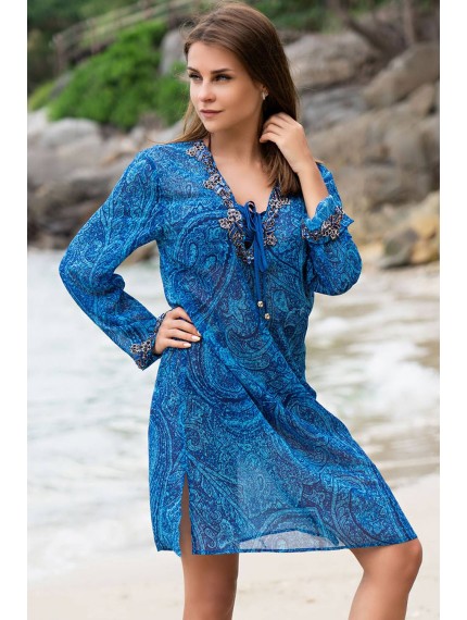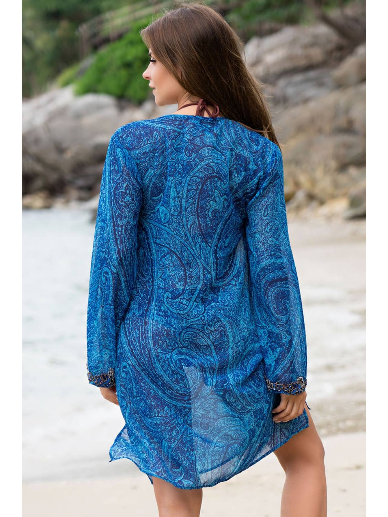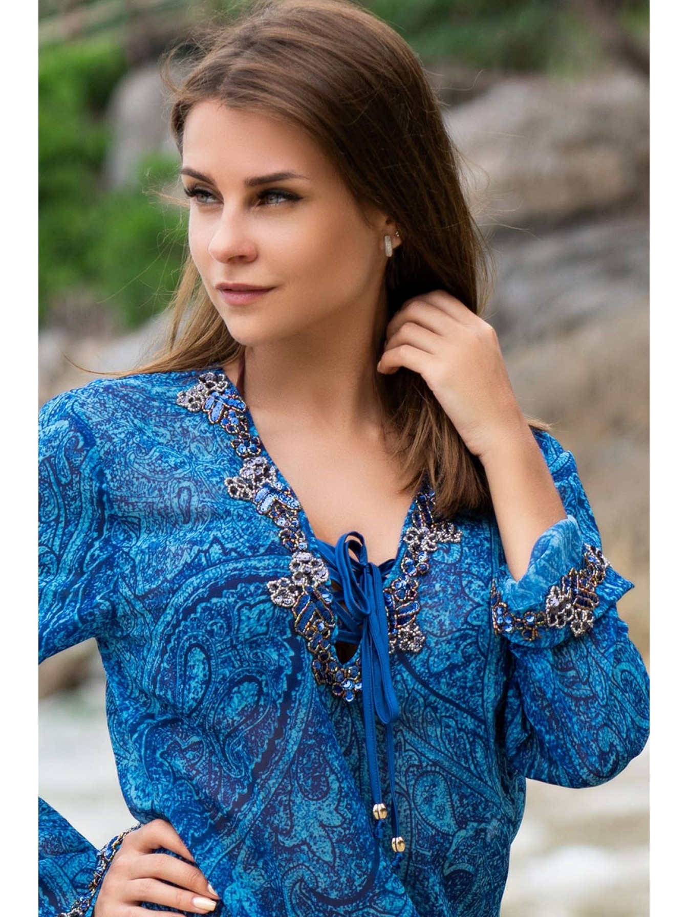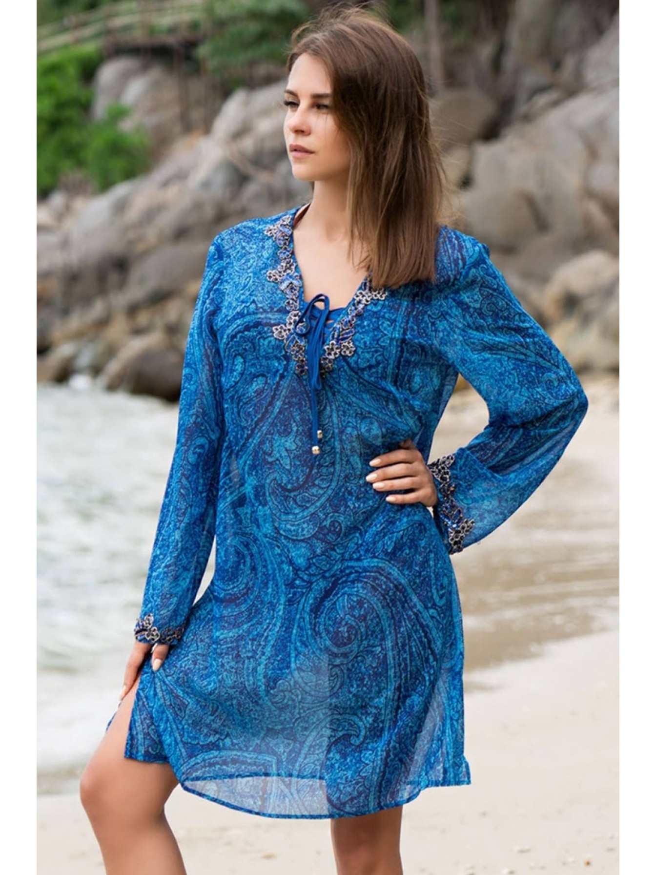 Короткая туника Mia-Amore с длинным рукавом выполнена из принтованного шифона в морской синей гамме, горловина и низ рукавов оформлены бисером и паетками, глубокий вырез горловины украшает шнуровка.