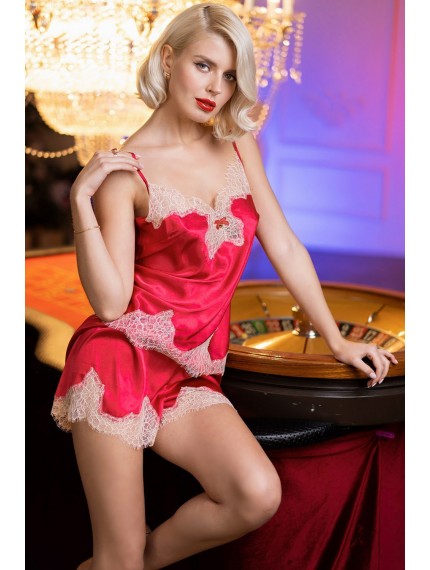 Комплект топ с шортами Mia-Amore выполнен из искусственного шелка рубинового цвета. Лиф и низ топа, а также шорты по низу декорированы кружевом. По центру лифа бантик с подвеской.