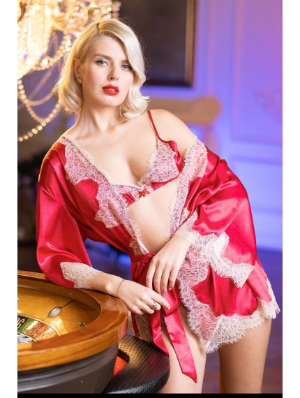 Комплект-тройка Mia-Amore состоит из бра на тонких бретелях, трусиков-стрингов и укороченного кимоно. Комплект выполнен из искусственного шелка рубинового цвета. Чашки бра, трусики, а также рукава кимоно, низ и борт декорированы кружевом. Укороченное кимоно завязывается широким эффектным поясом.