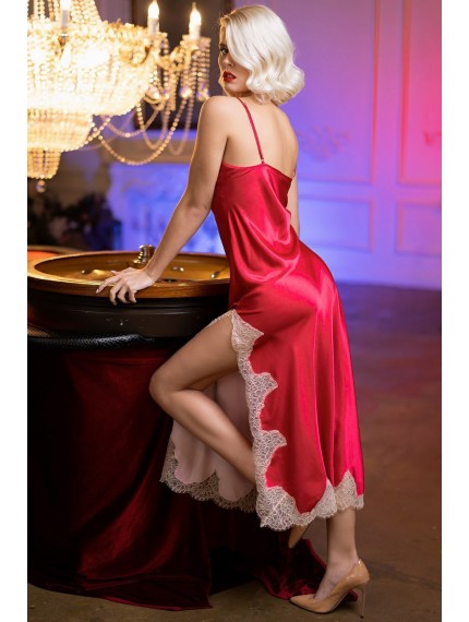 Длинная сорочка Mia-Amore на регулируемых тонких бретелях выполнена из искусственного шелка рубинового цвета. Лиф, низ сорочки и разрез сбоку декорированы кружевом. По центру лифа бантик с подвеской.