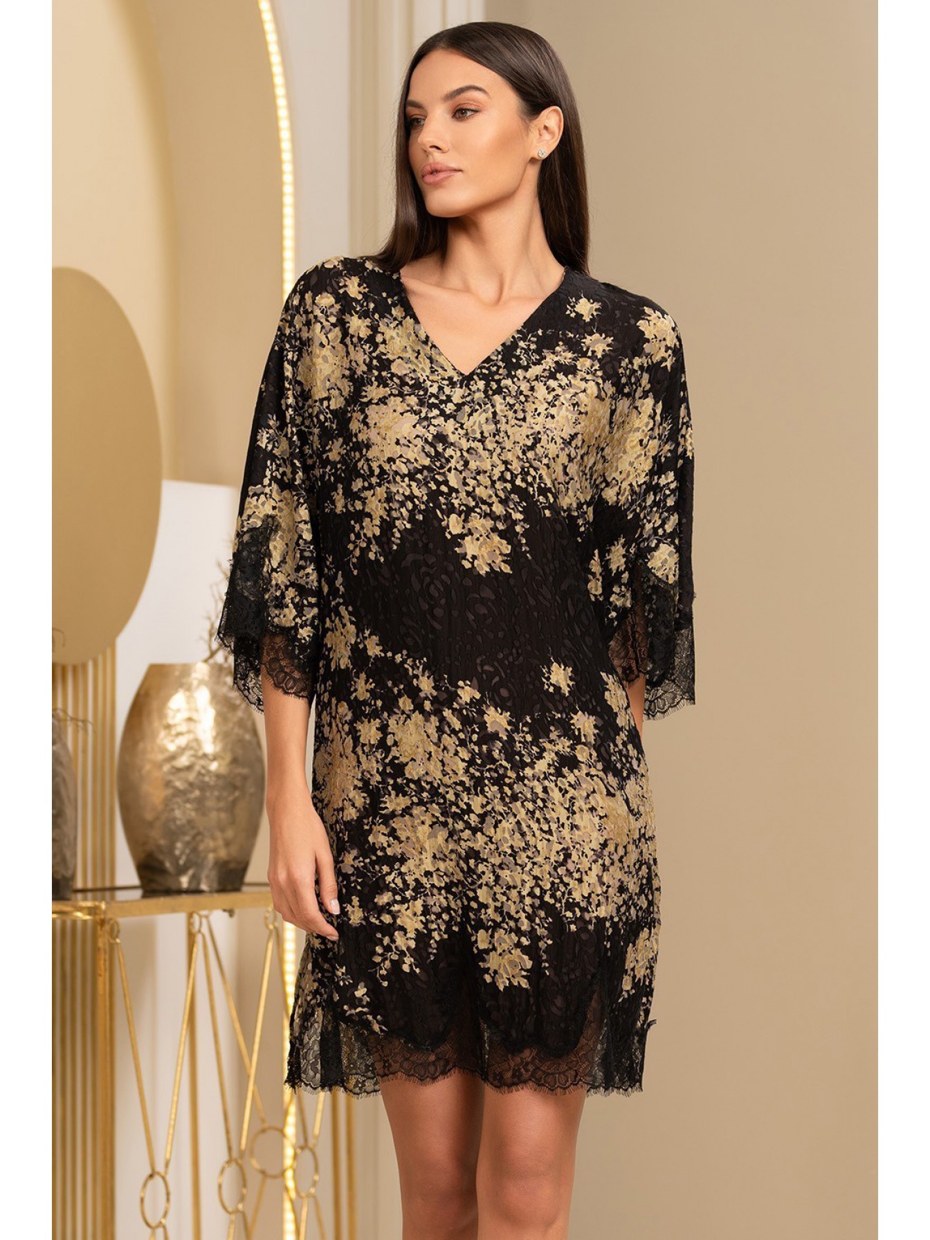 Короткая туника Mia-Amore выполнена из вискозно-шёлкового полотна деворе. Туника с V-образной горловиной и цельнокроенным удлинённым рукавом по талии затягивается съёмным поясом. Низ туники и рукавов украшены ажурным чёрным кружевом.