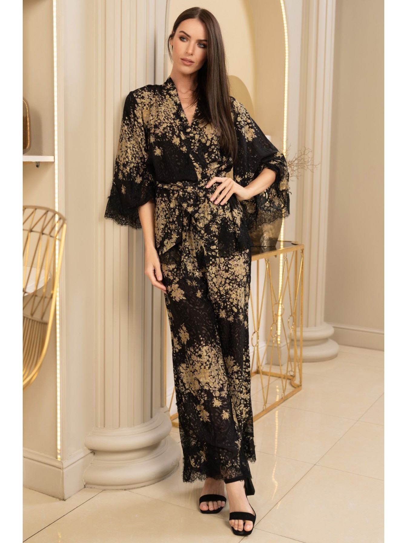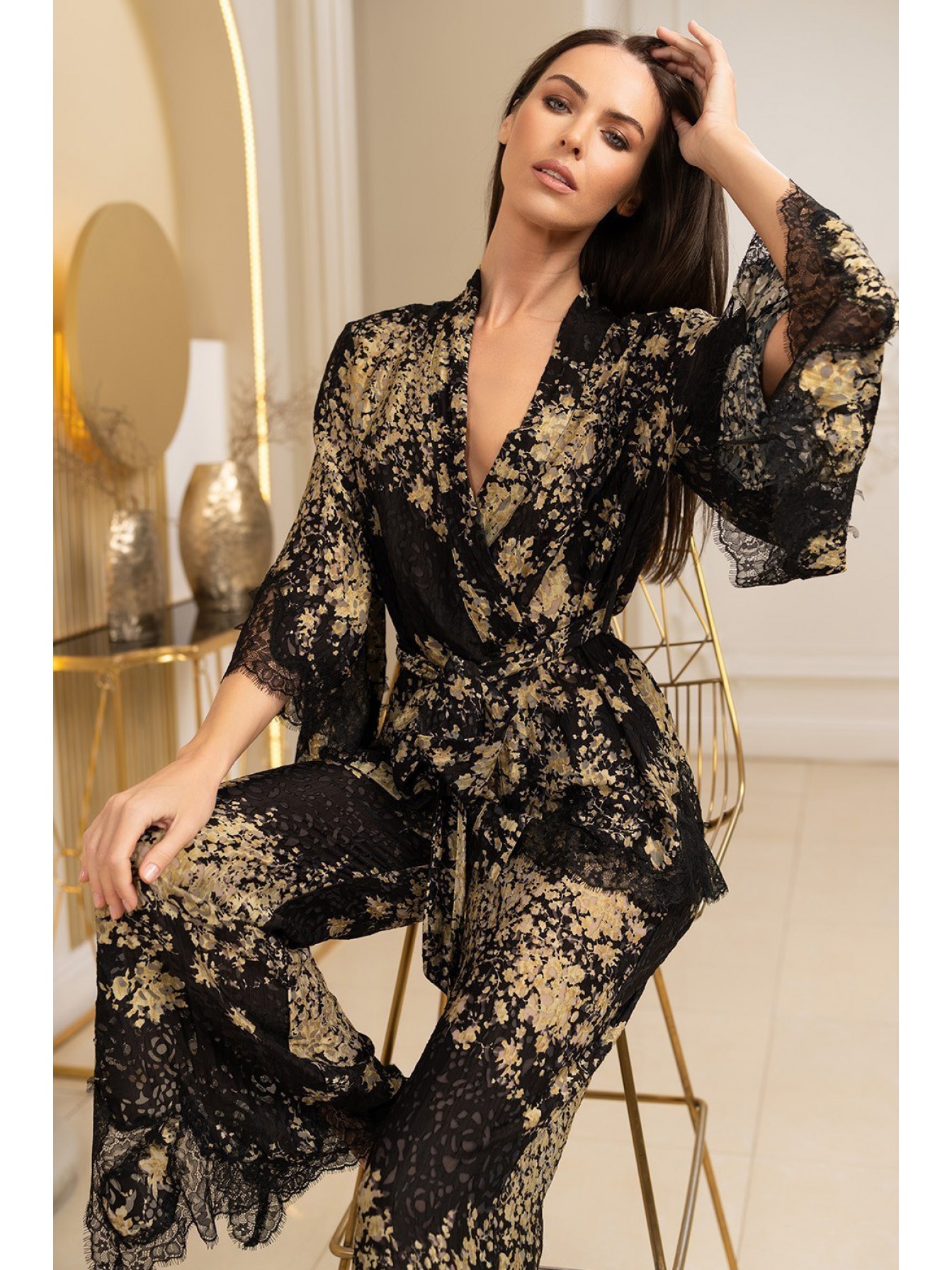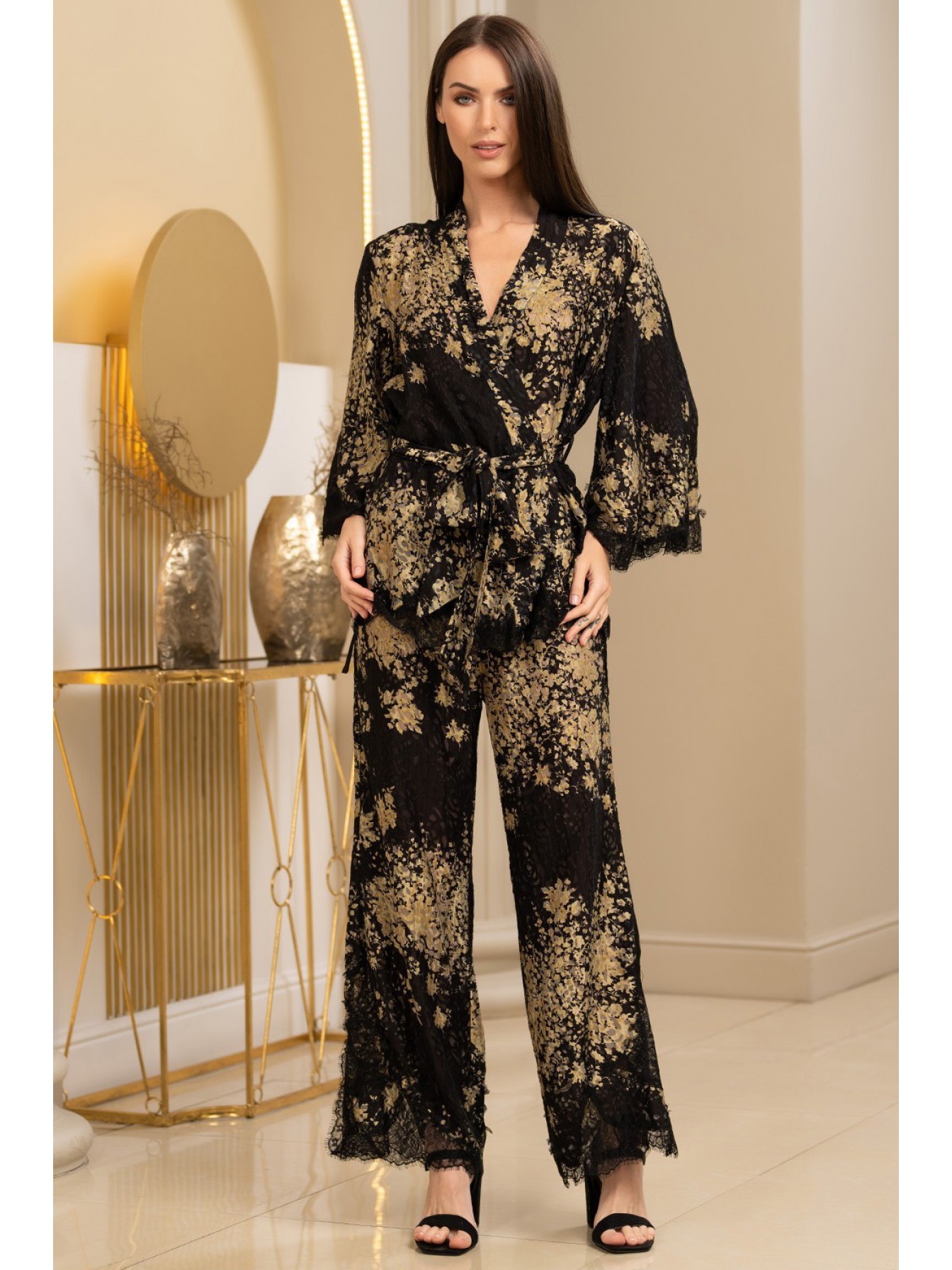 Комплект-двойка Mia-Amore состоит из запашного жакета с рукавами длиной 7/8 и брюк, выполнен из вискозно-шёлкового полотна деворе. По низу жакета, рукавов и по низу брюк отделка из чёрного ажурного кружева. Жакет запахивается широким съёмным поясом.