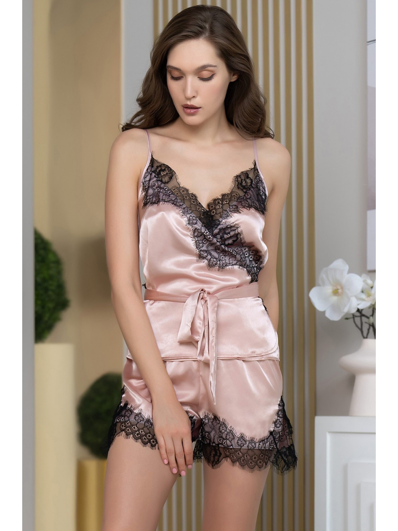 Комплект с шортами и топом на тонких бретелях Mia-Amore выполнен из смесового шёлка. Шорты с боковыми разрезами отделаны по низу кружевом. Топ запашной с завязкой в виде широкого пояса, лиф топа также декорирован кружевом.
