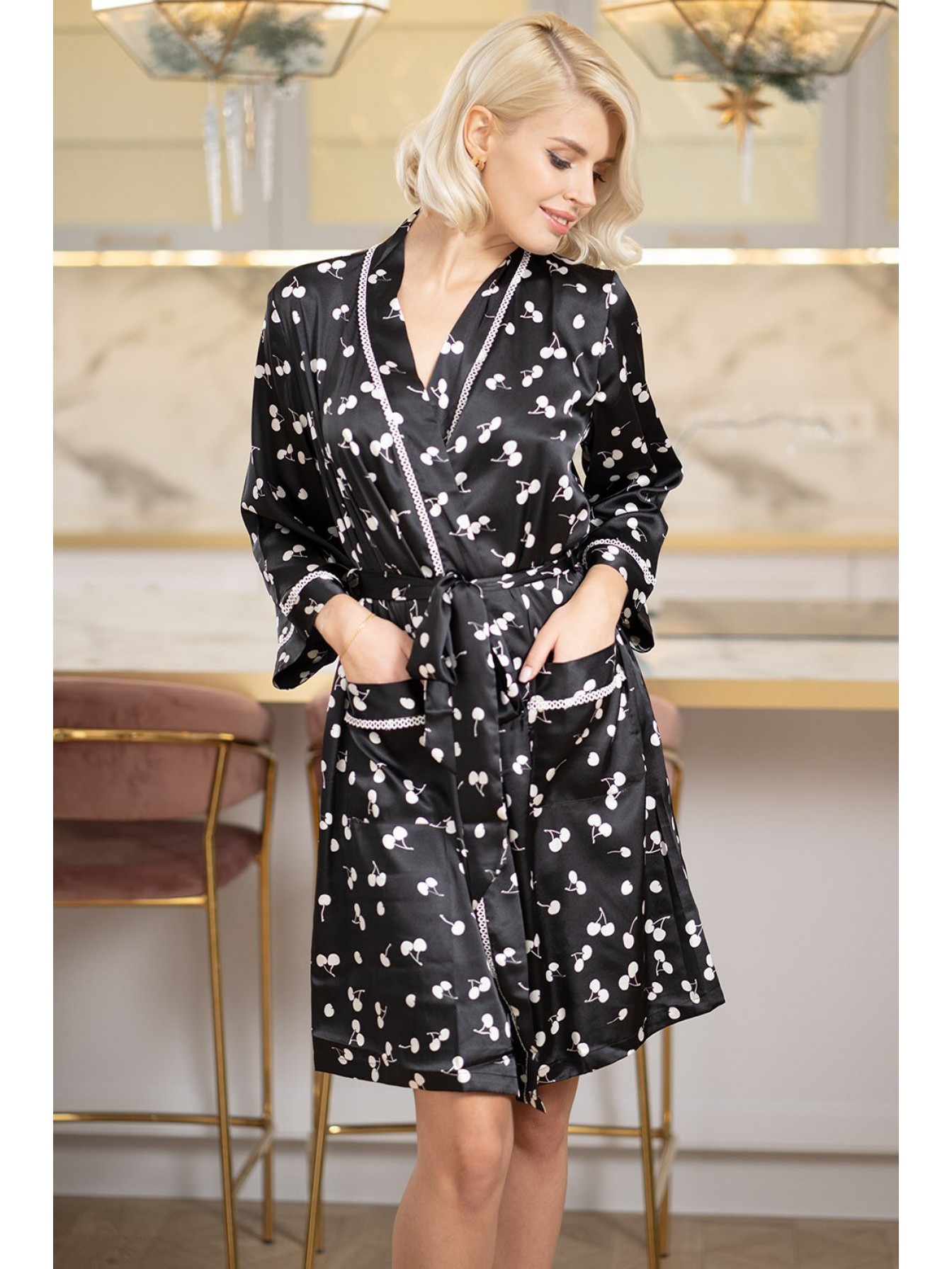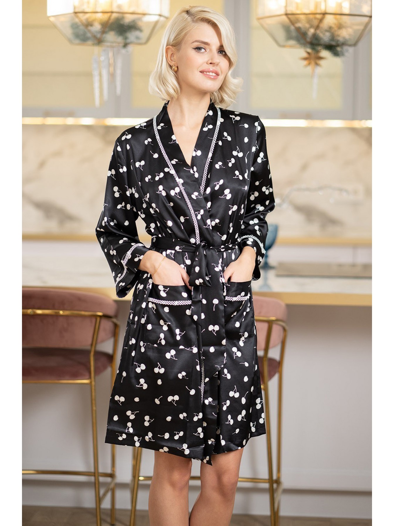 Короткий запашной халат Mia-Amore с рукавами длиной 3/4 выполнен из принтованного двухцветного искусственного шелка. Борт, рукава и карманы халата украшены белым кружевом. Комплектуется поясом.