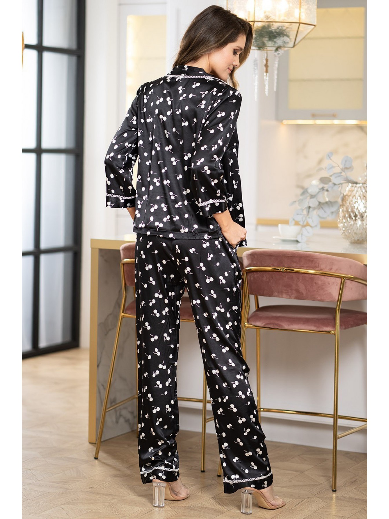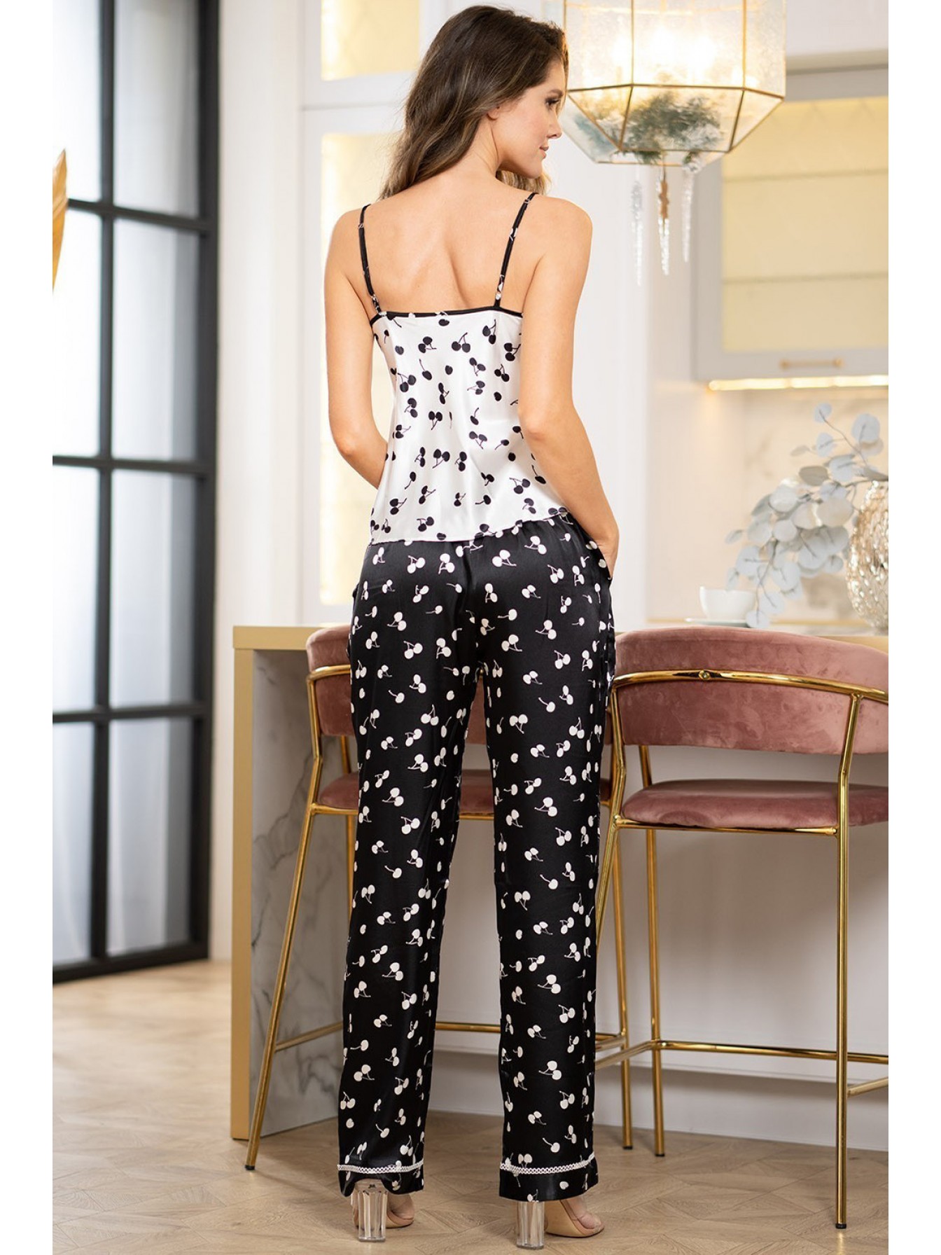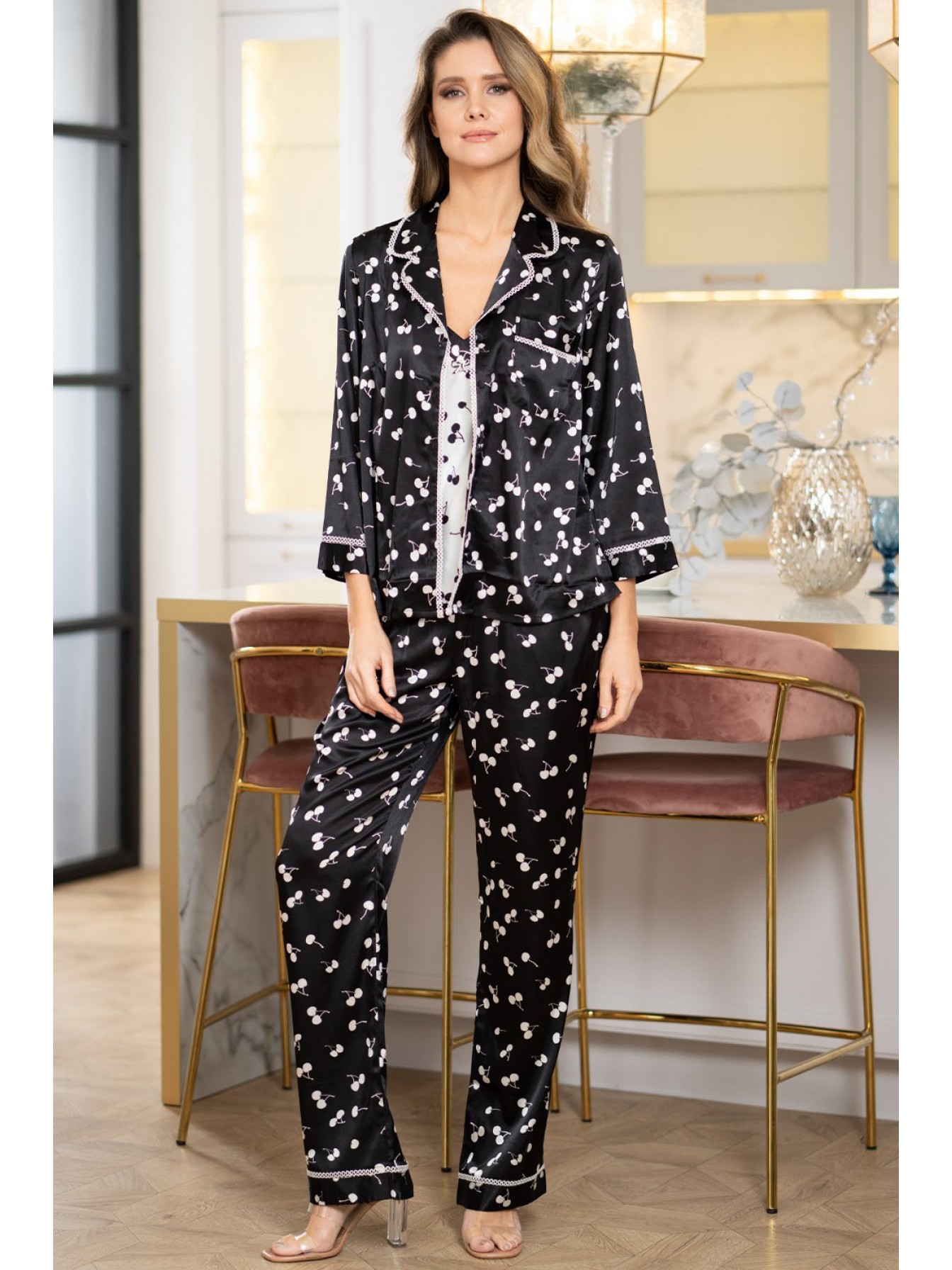 Комплект тройка Mia-Amore состоит из рубашки с длинным рукавом, с центральной застежкой на пуговицы, брюк и топа, которые выполнены из принтованного двухцветного искусственного шелка. Борт, воротник, рукава и карманы рубашки и брюки по низу украшены белым кружевом. Топ выполнен из белого атласа с черным принтом, лиф топа украшен контрастной отделкой и кружевом. Комплект дополнен поясом.