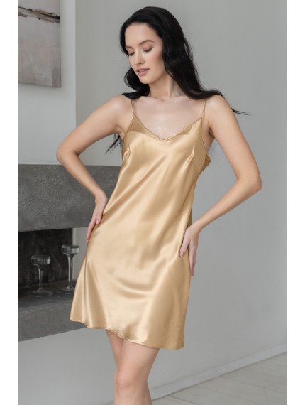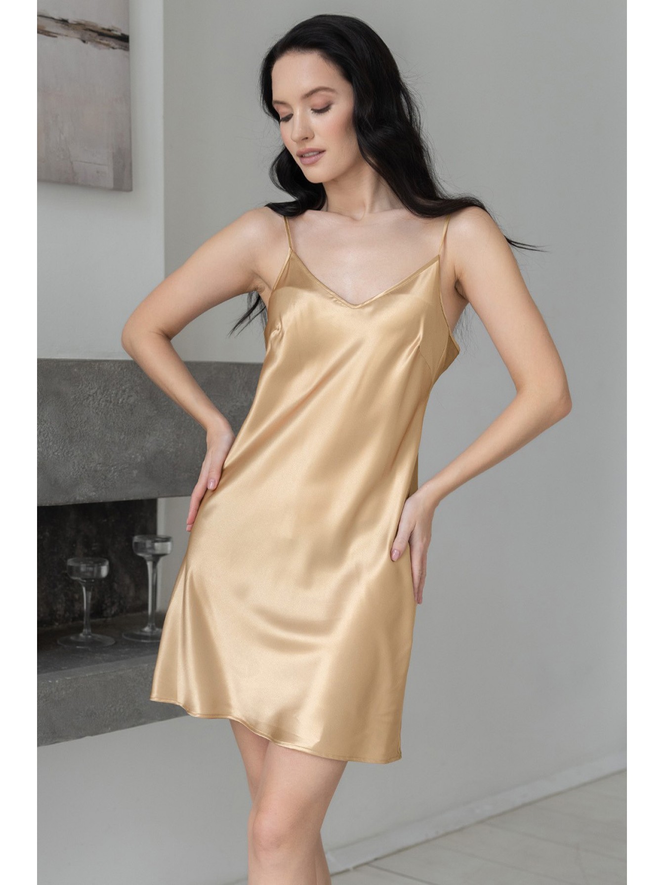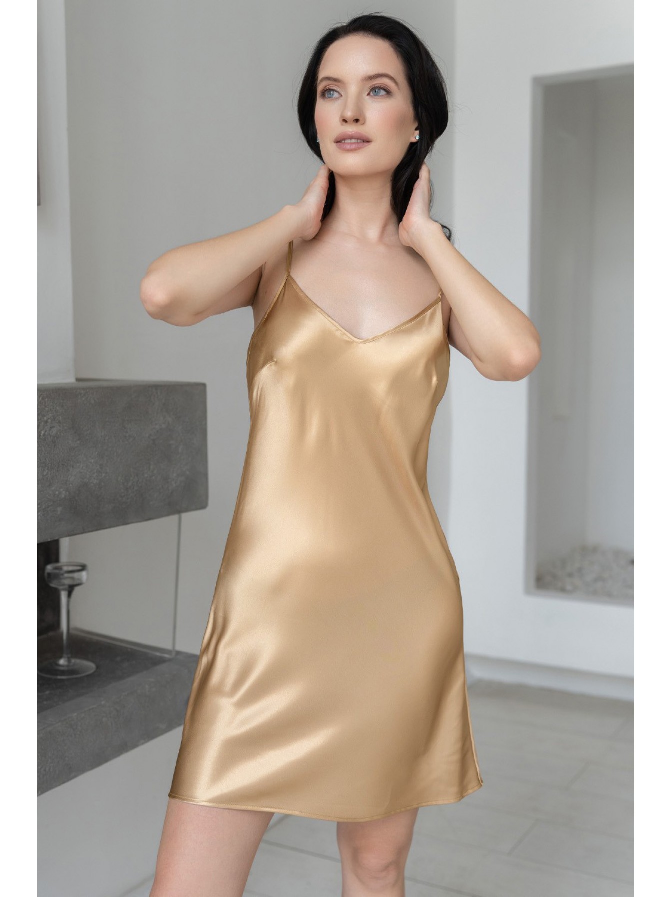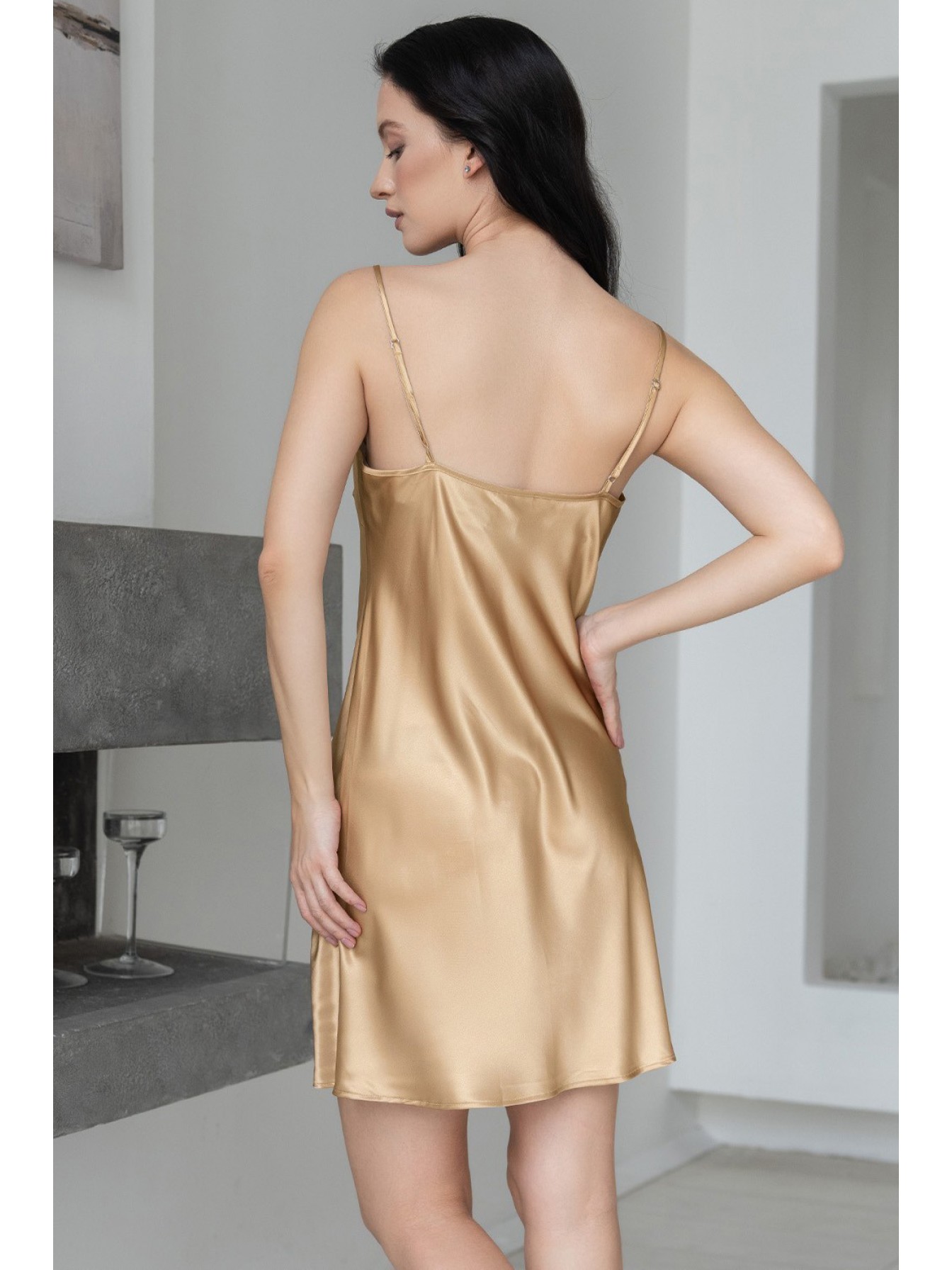Короткая сорочка с вытачками Mia-Mella на груди на тонких бретелях выполнена из однотонного искусственного шелкового полотна с атласным блеском.