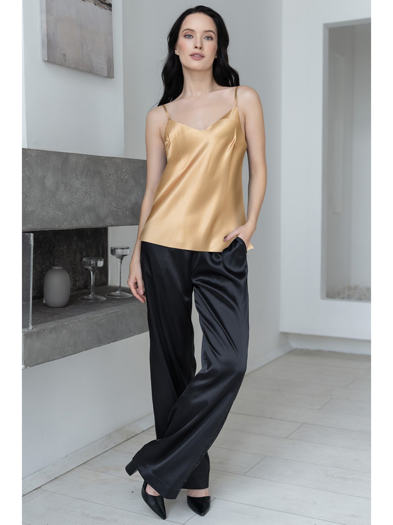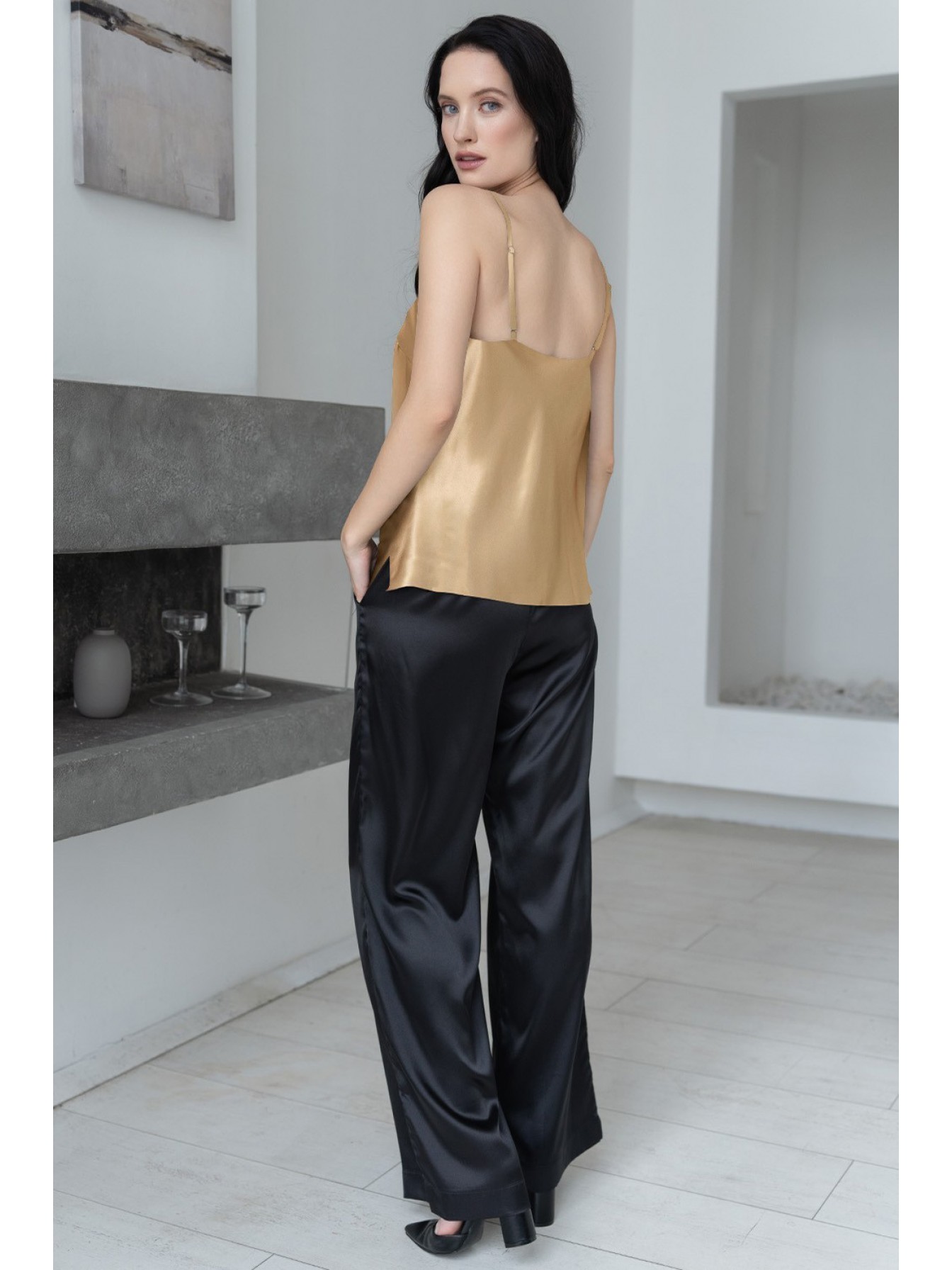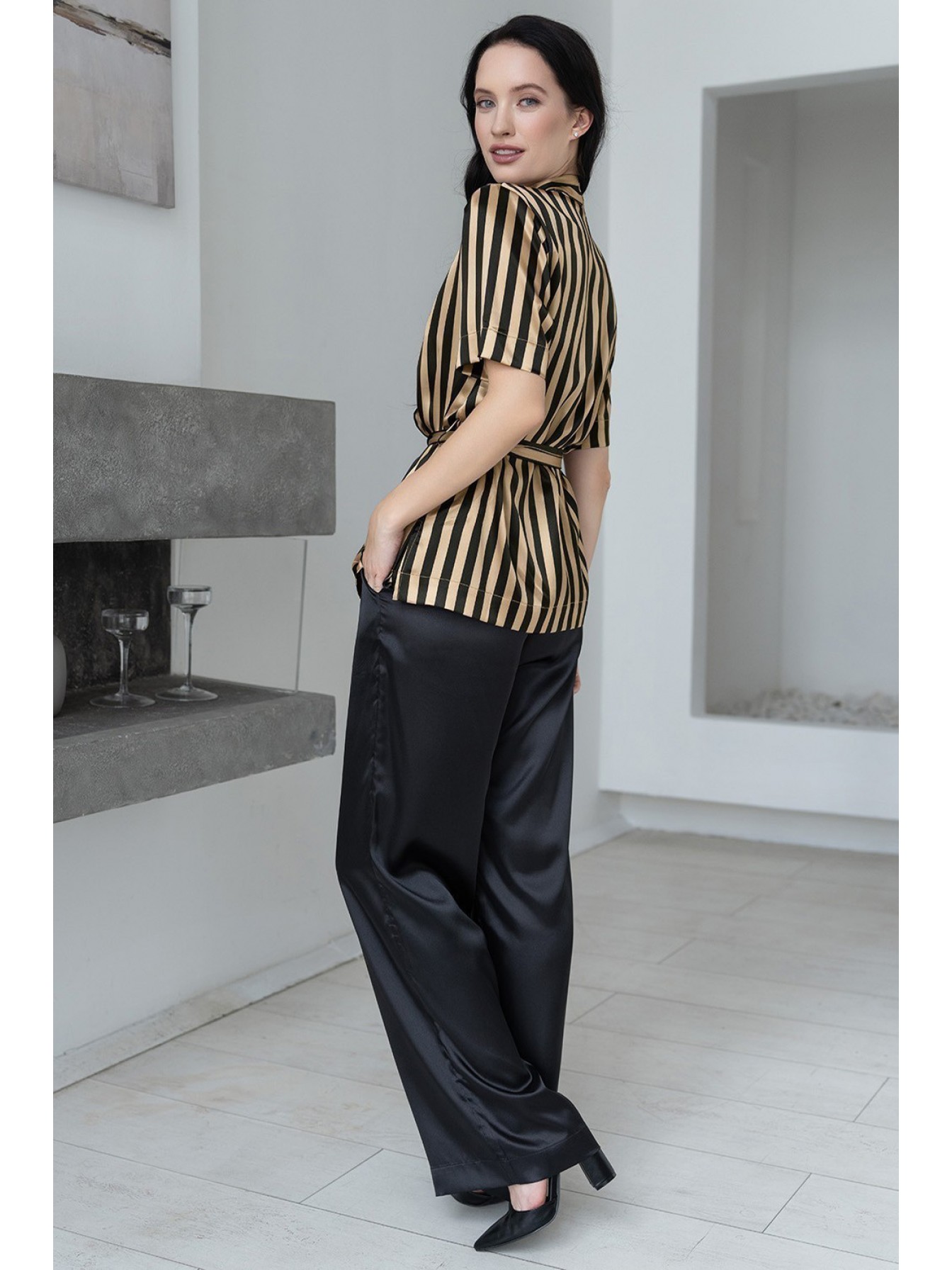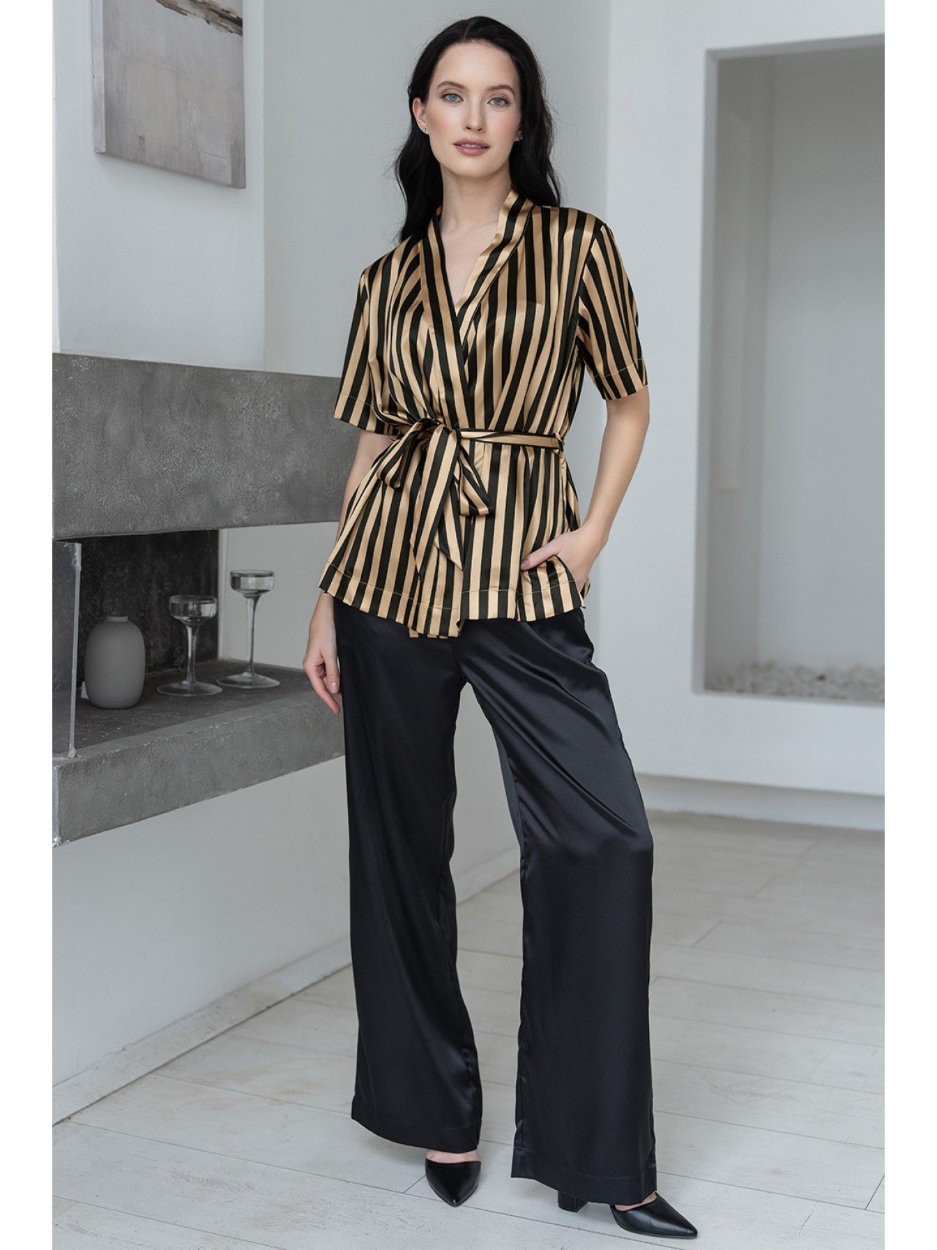 Комплект-тройка Mia-Mella состоит из жакета c короткими рукавами, топа и брюк. Топ и брюки выполнены из однотонного искусственного шелкового полотна с атласным блеском, а жакет – из принтованного. По талии жакет запахивается на пояс, в боковых швах брюк обработаны карманы.
