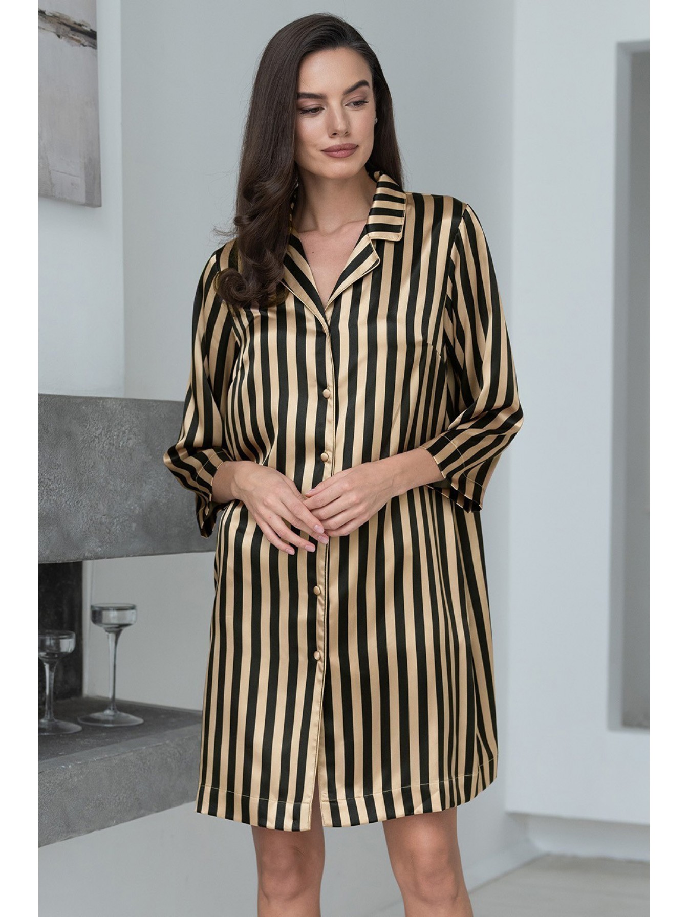 Рубашка Mia-Mella с центральной застежкой на пуговицы с рукавами длиной 3/4, выполнена из принтованного искусственного шелкового полотна с атласным блеском. Борт и воротник рубашки декорированы контрастным кантом.