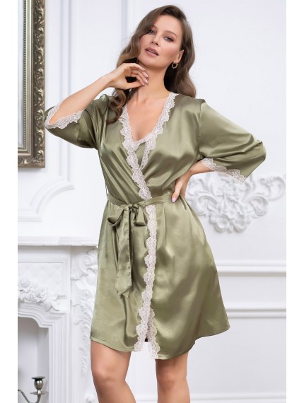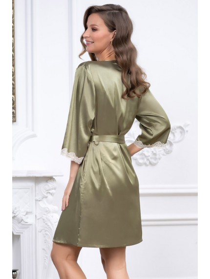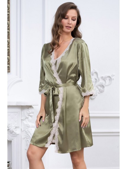 Короткий халат Mia-Mella с рукавами 3/4 выполнен из искусственного шелкового полотна с атласным блеском. Рукава и борта халата декорированы изящным кружевом. Халат на запахе с поясом, в боковых швах есть карманы.
