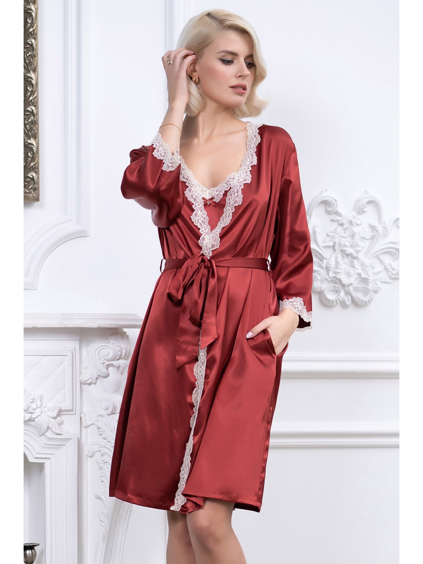 Короткий халат Mia-Mella с рукавами 3/4 выполнен из искусственного шелкового полотна с атласным блеском. Рукава и борта халата декорированы изящным кружевом. Халат на запахе с поясом, в боковых швах есть карманы.