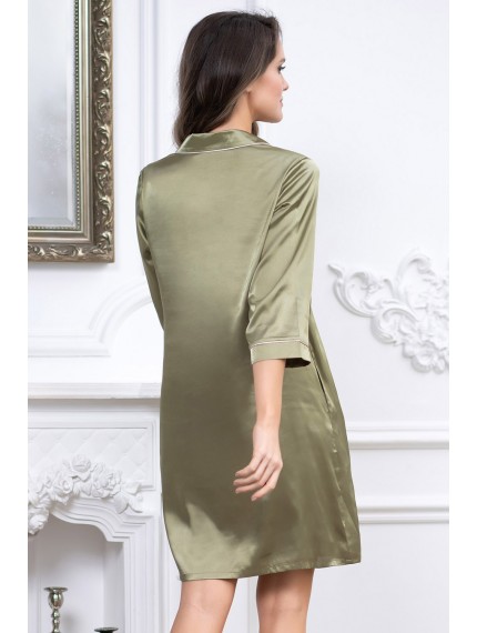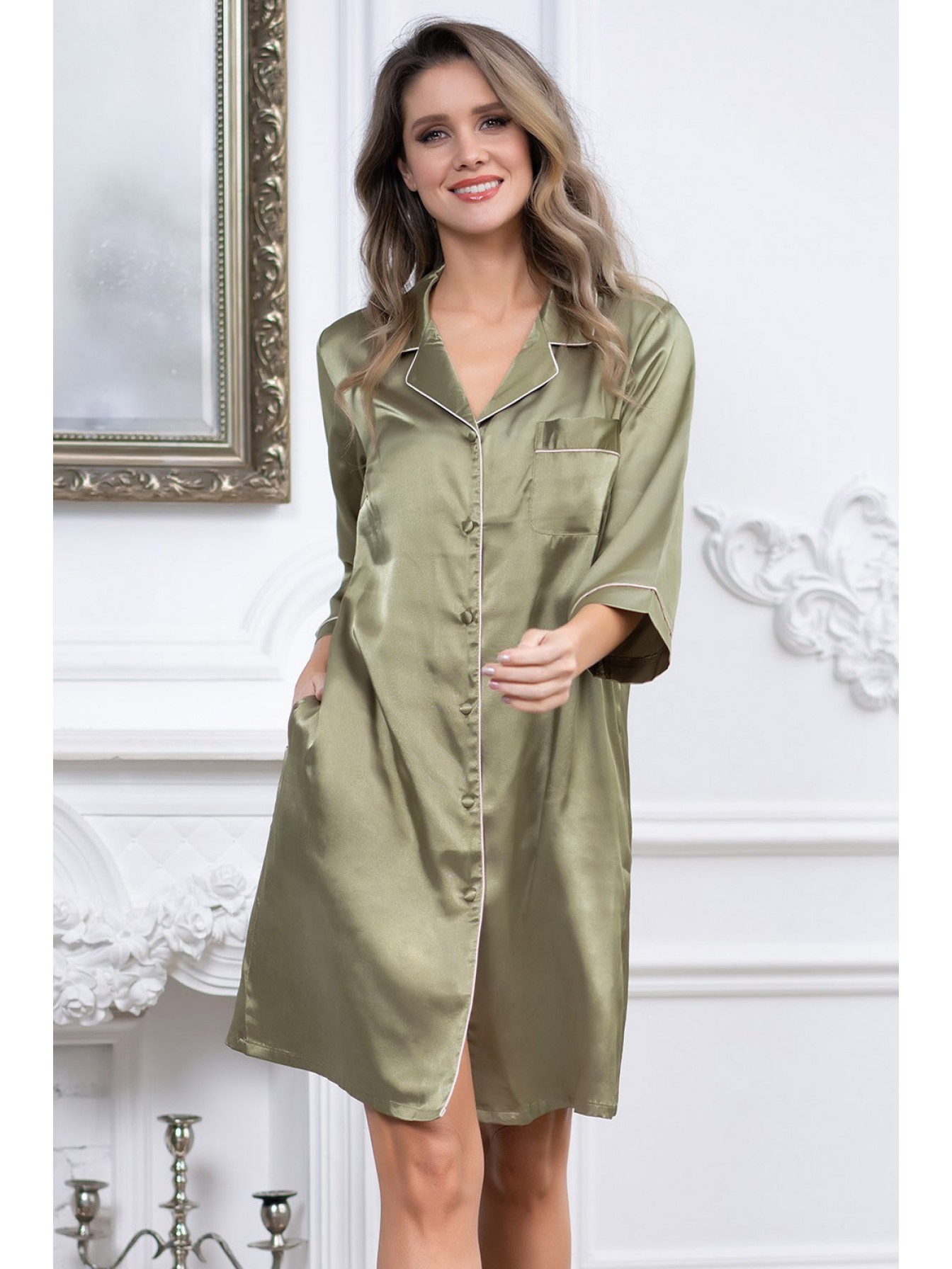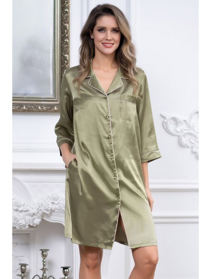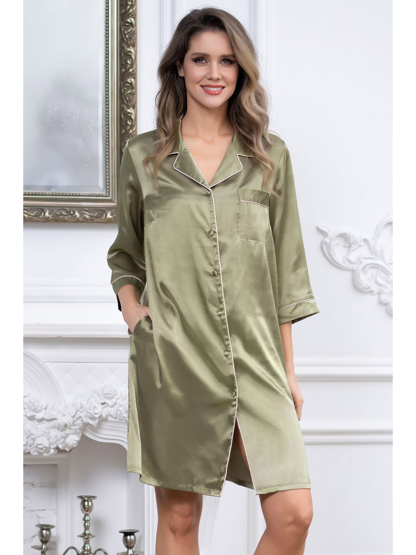Рубашка Mia-Mella с центральной застежкой на пуговицах с рукавами длиной 3/4, выполнена ,  , из искусственного шелкового полотна с атласным блеском. Низ рукавов, борт и воротник обработаны атласными кантами.