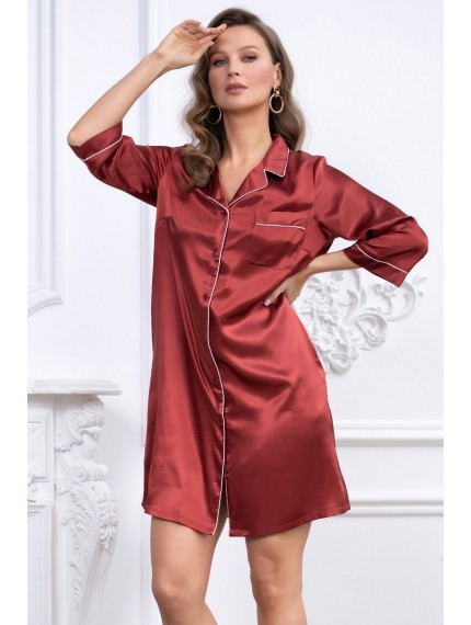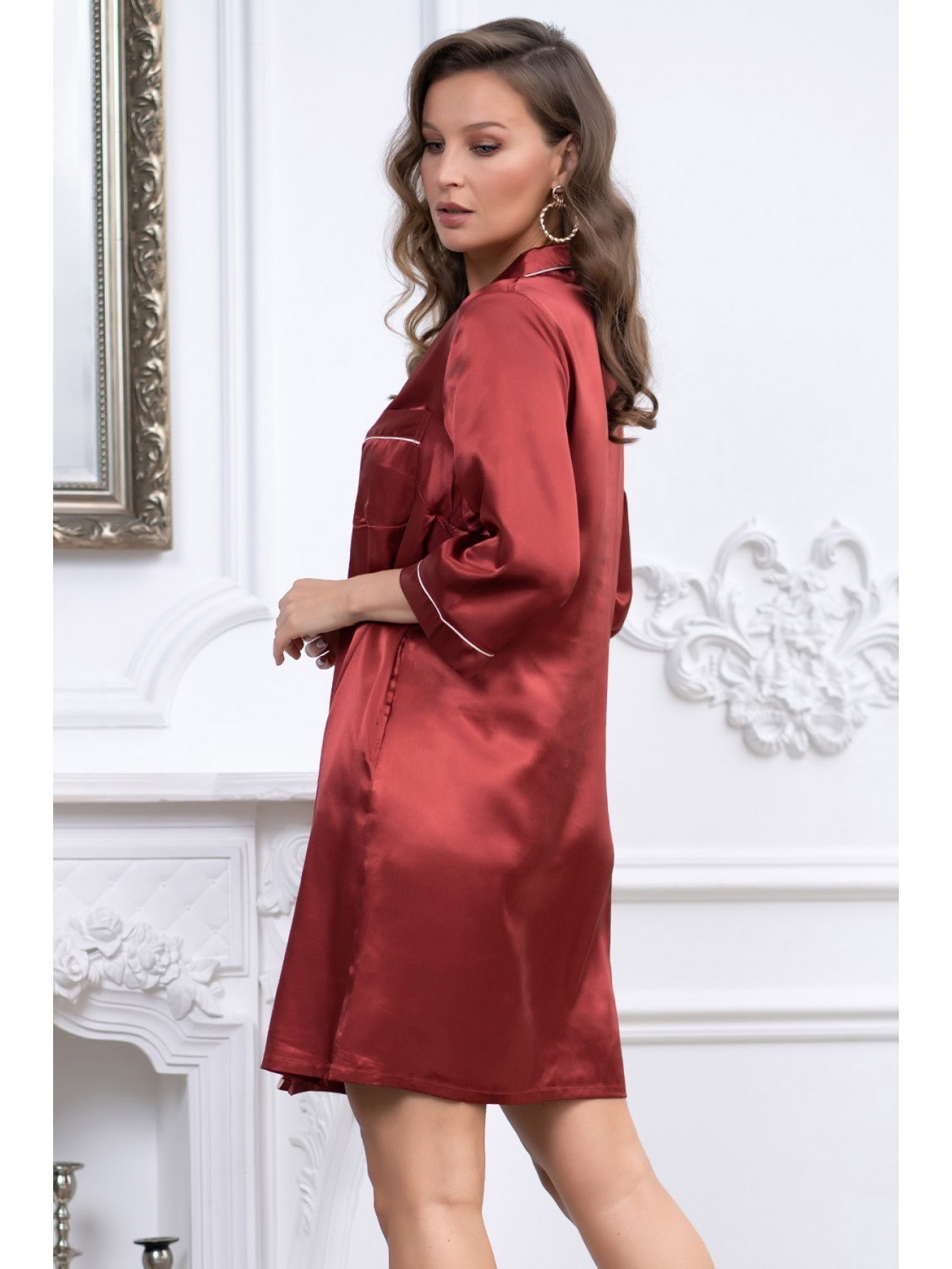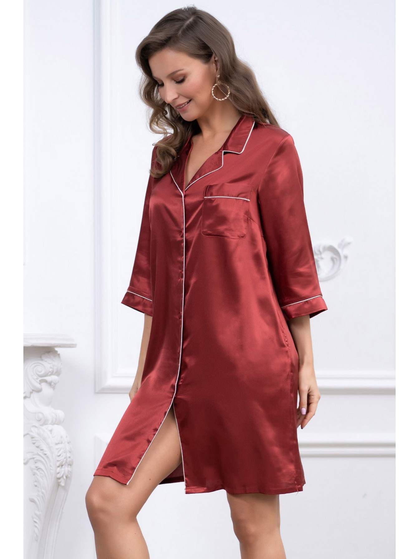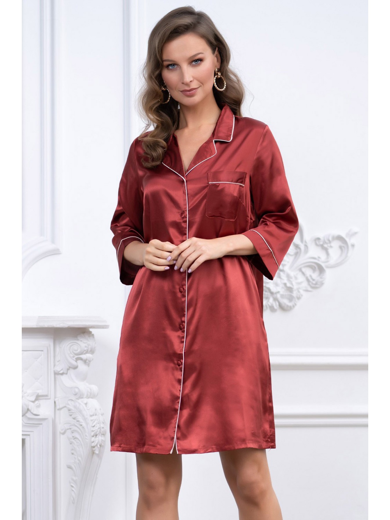 Рубашка Mia-Mella с центральной застежкой на пуговицах с рукавами длиной 3/4, выполнена ,  , из искусственного шелкового полотна с атласным блеском. Низ рукавов, борт и воротник обработаны атласными кантами.