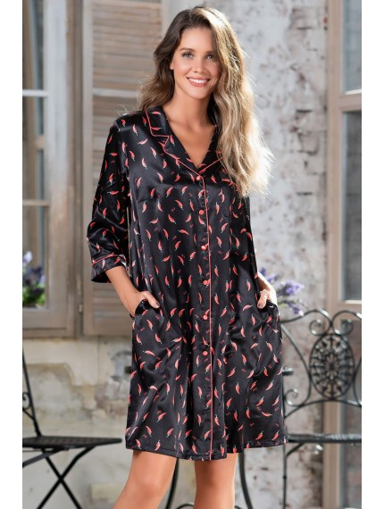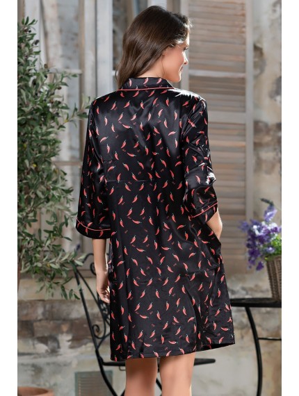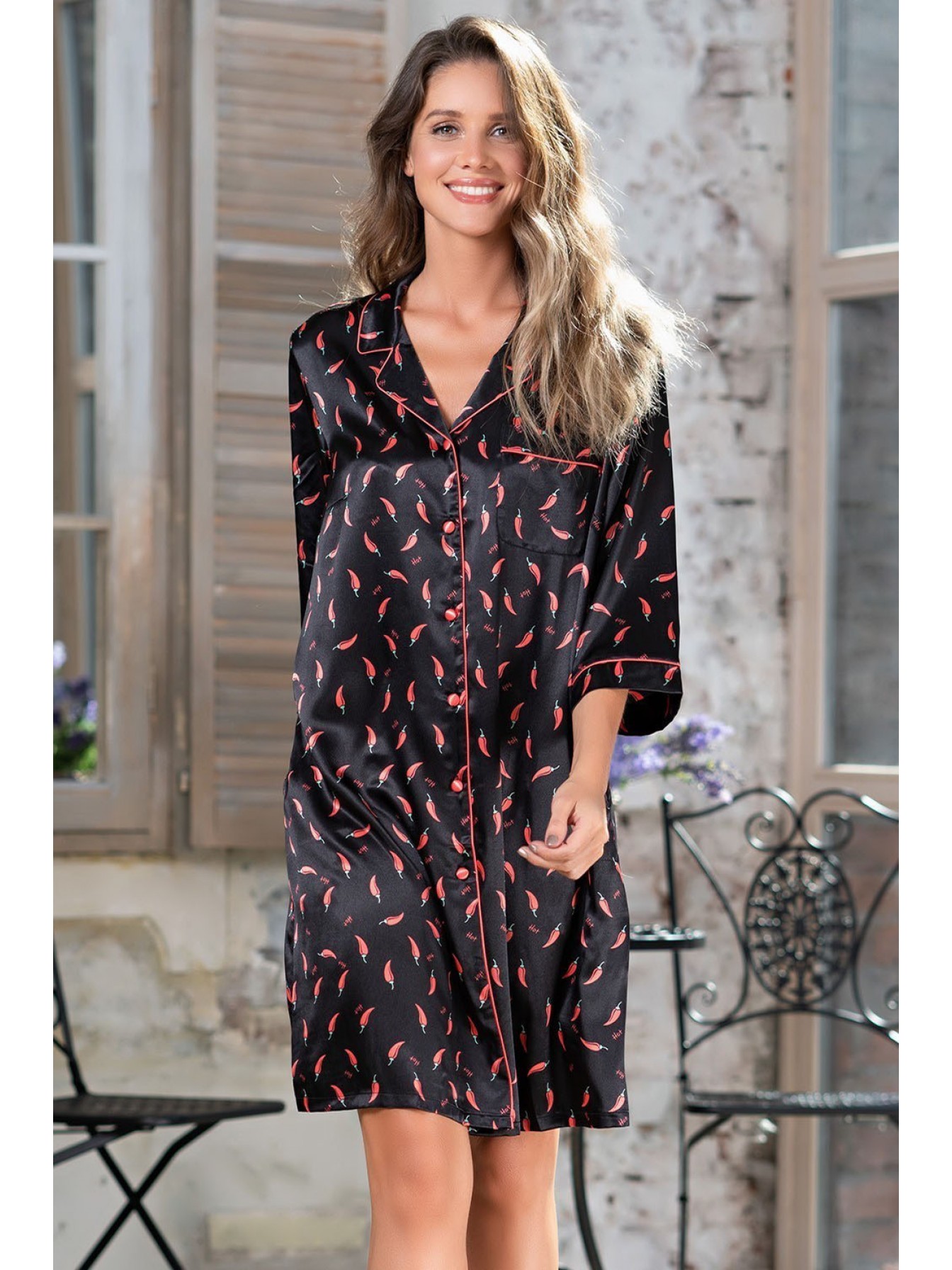 Рубашка Mia-Mella с центральной застежкой на пуговицы с рукавами длиной 3/4, выполнена из принтованного искусственного шелкового полотна с атласным блеском. Низ рукавов, борт и воротник декорированы контрастным кантом.