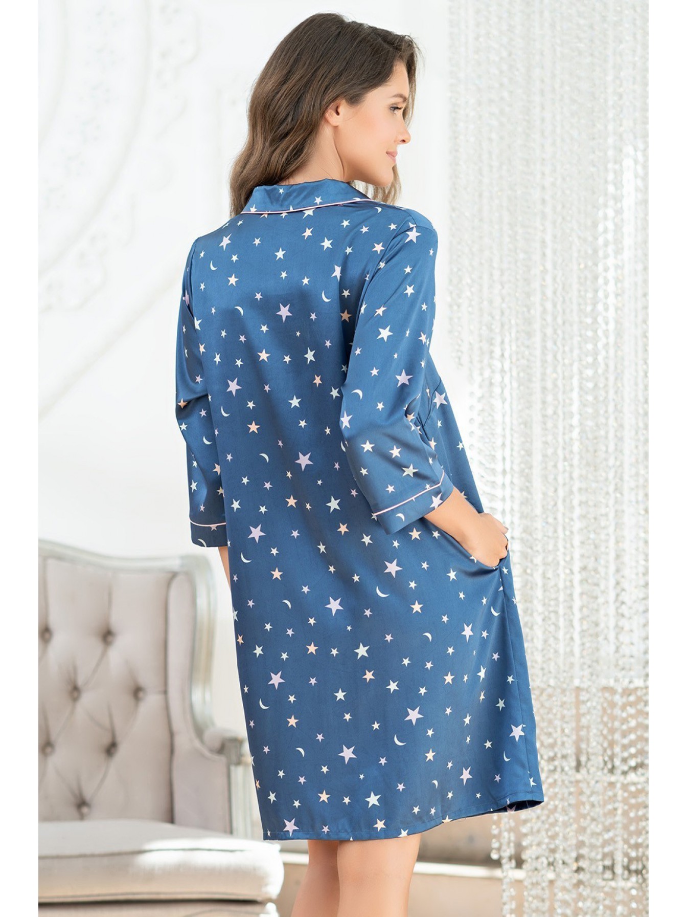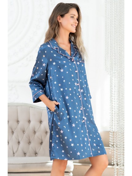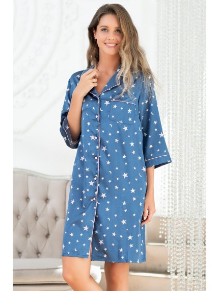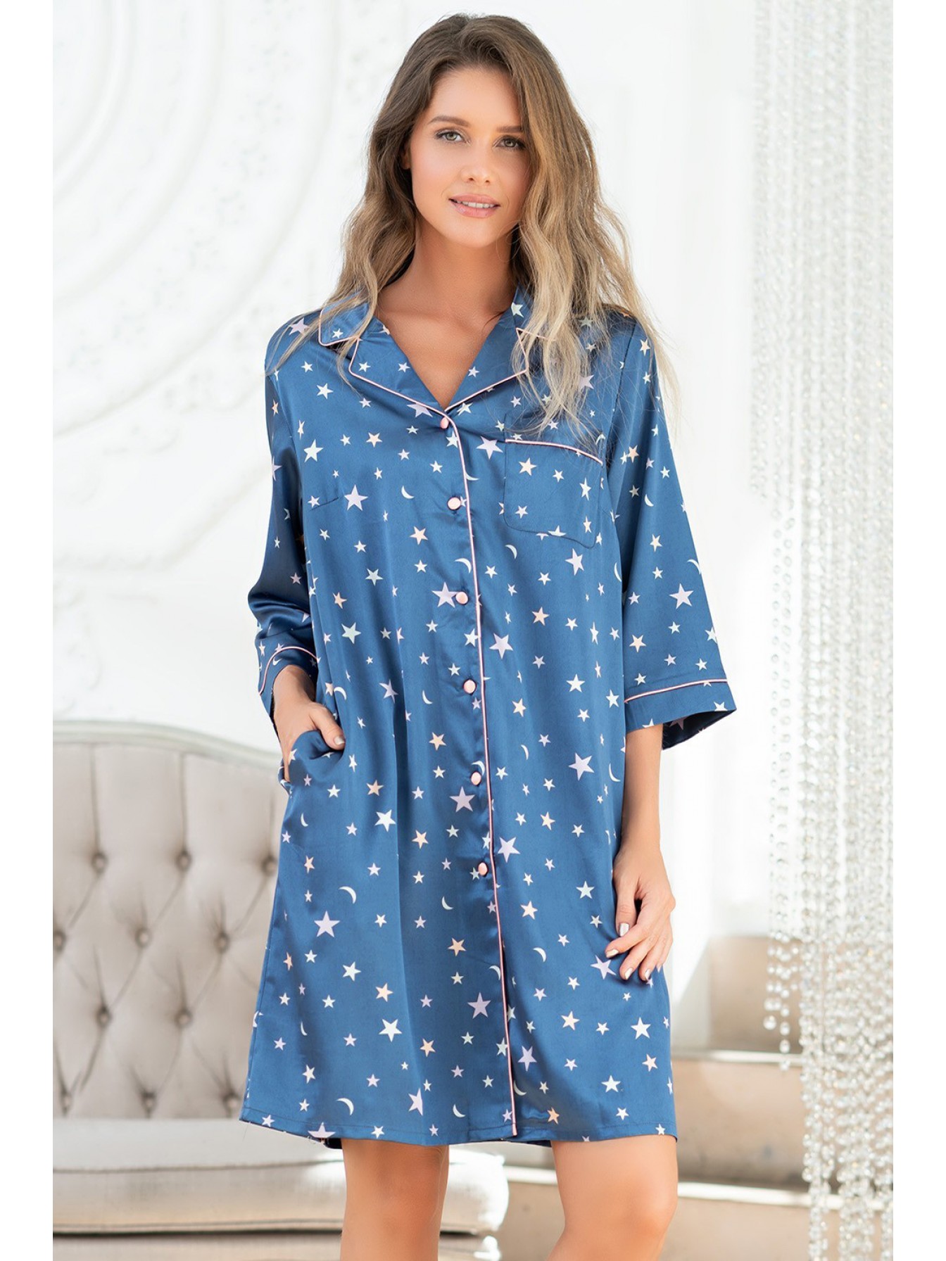 Рубашка Mia-Mella с центральной застежкой на пуговицы на пуговицах с рукавами длиной 3/4, выполнена из принтованного искусственного шелкового полотна с атласным блеском. Низ рукавов, борт и воротник декорированы контрастным кантом.