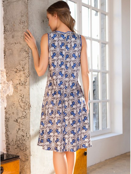 Домашнее женское платье Mia-Mia полуприлегающего силуэта из принтованного сатина. Однотонная окантовка по пройме и горловине, шов по спинке придает приталенность модели.