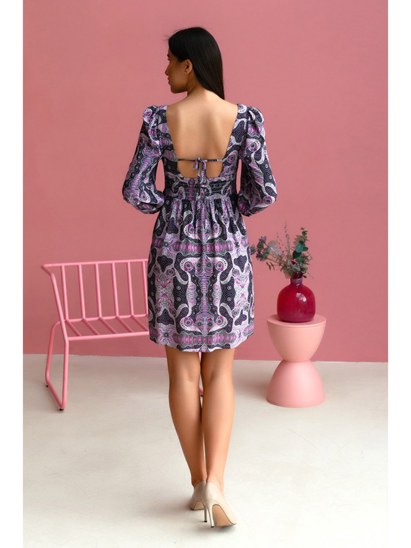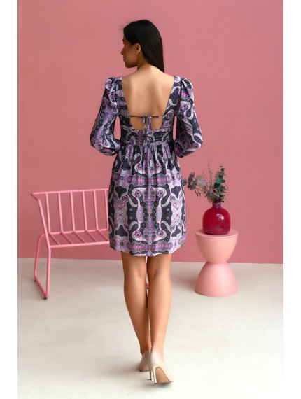 Платье миди с завышенной линией талии, из принтованной вискозы. Лиф по центру на сборке. Юбка и лиф соединены деталью(, сборкой), . Фигурный вырез создает красивую зону декольте, На спинке вырез регулируется с помощью шнура-завязки. Рукав пышный (, фонарик), , расширенный к низу, низ рукава на эластичной тесьме.