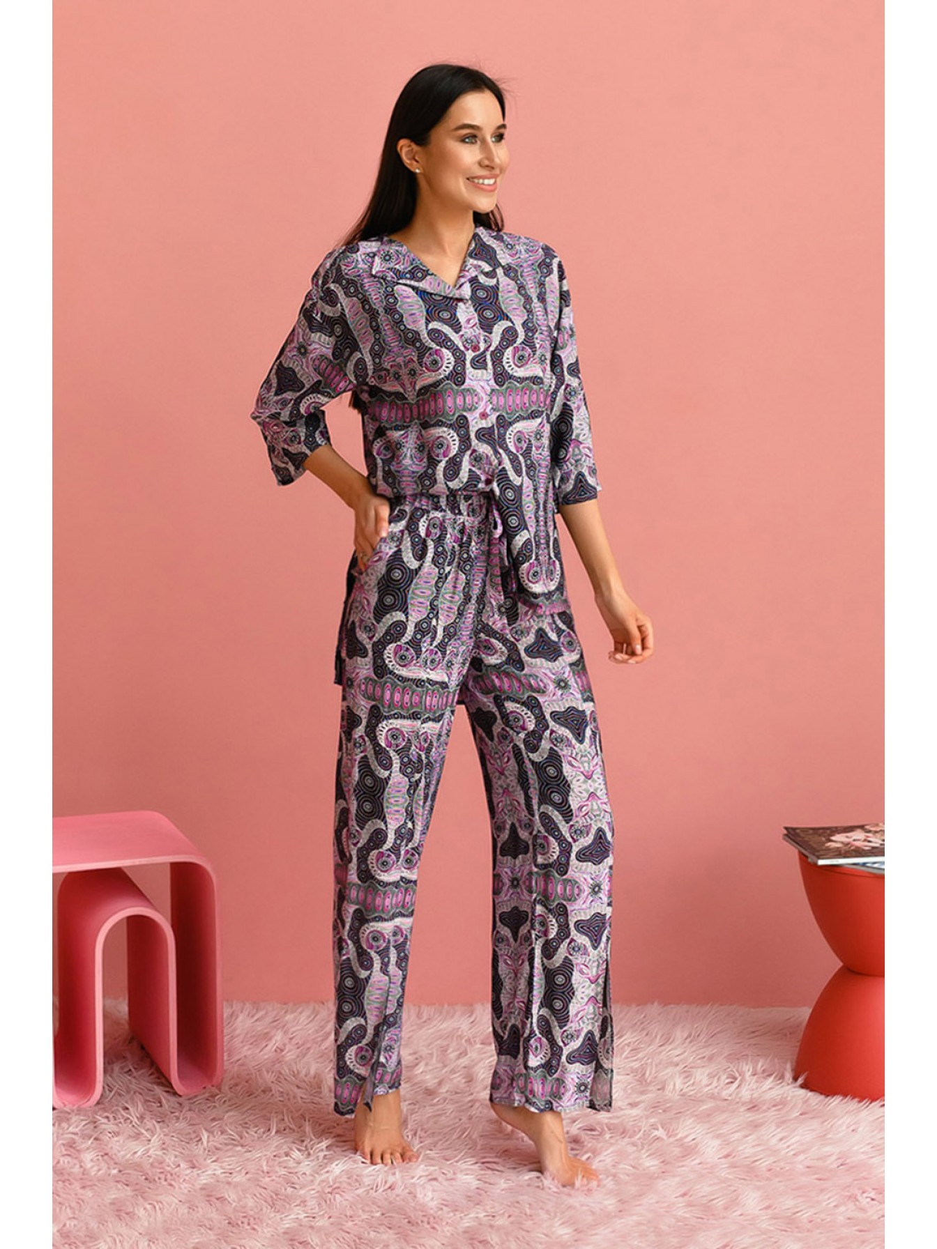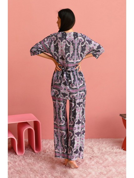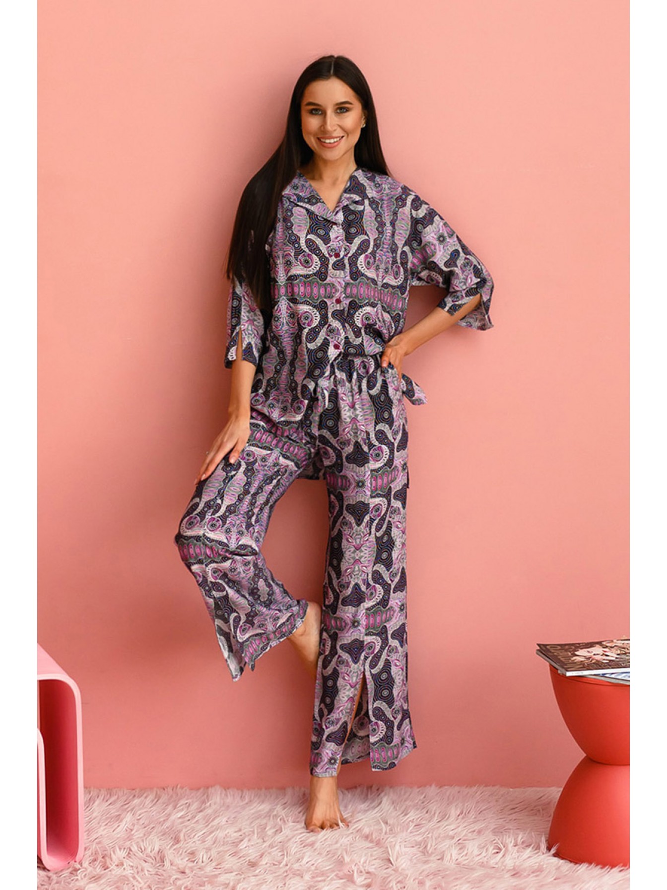 Комплект из туники и брюк, выполнен из принтованной вискозы. Туника свободного силуэта. Полочка укороченная, с застежкой планкой на пуговицах и отложным воротником. Спинка удлиненная, горловина на спинке обработана обтачкой. Разрезы в боковых швах. Рукав 7/8 с разрезом по верхнему шву. Брюки с карманами, свободного силуэта с разрезами по передней детали. Пояс на завязке-кулиске и эластичной ленте.
