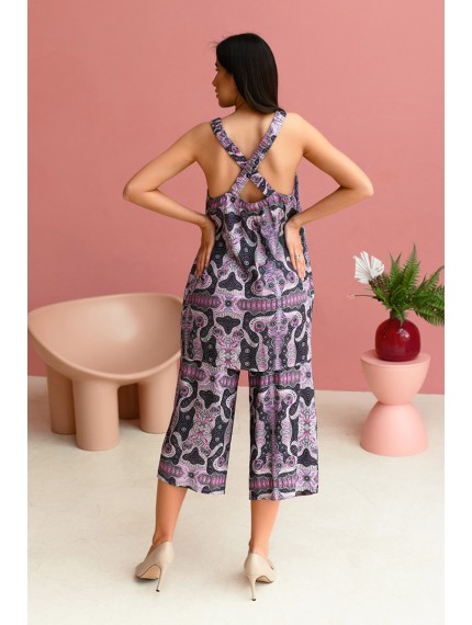 Комплект из удлиненного топа и шорт-бермуды, из принтованной вискозы. Топ с запахом на широких бретелях. На полочке подрез (, прямая кокетка), соединяется с основной деталью на сборке. На спинке верхний срез на эластичной тесьме. Бретели с эластичной тесьмой. Удлиненные свободные шорты - бермуды с карманами. Пояс на завязке-кулиске и эластичной тесьме.