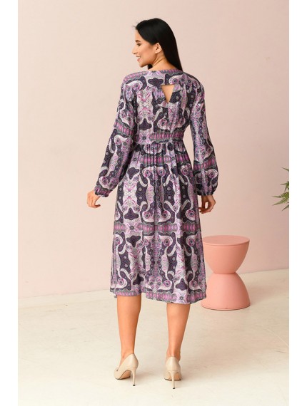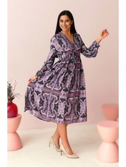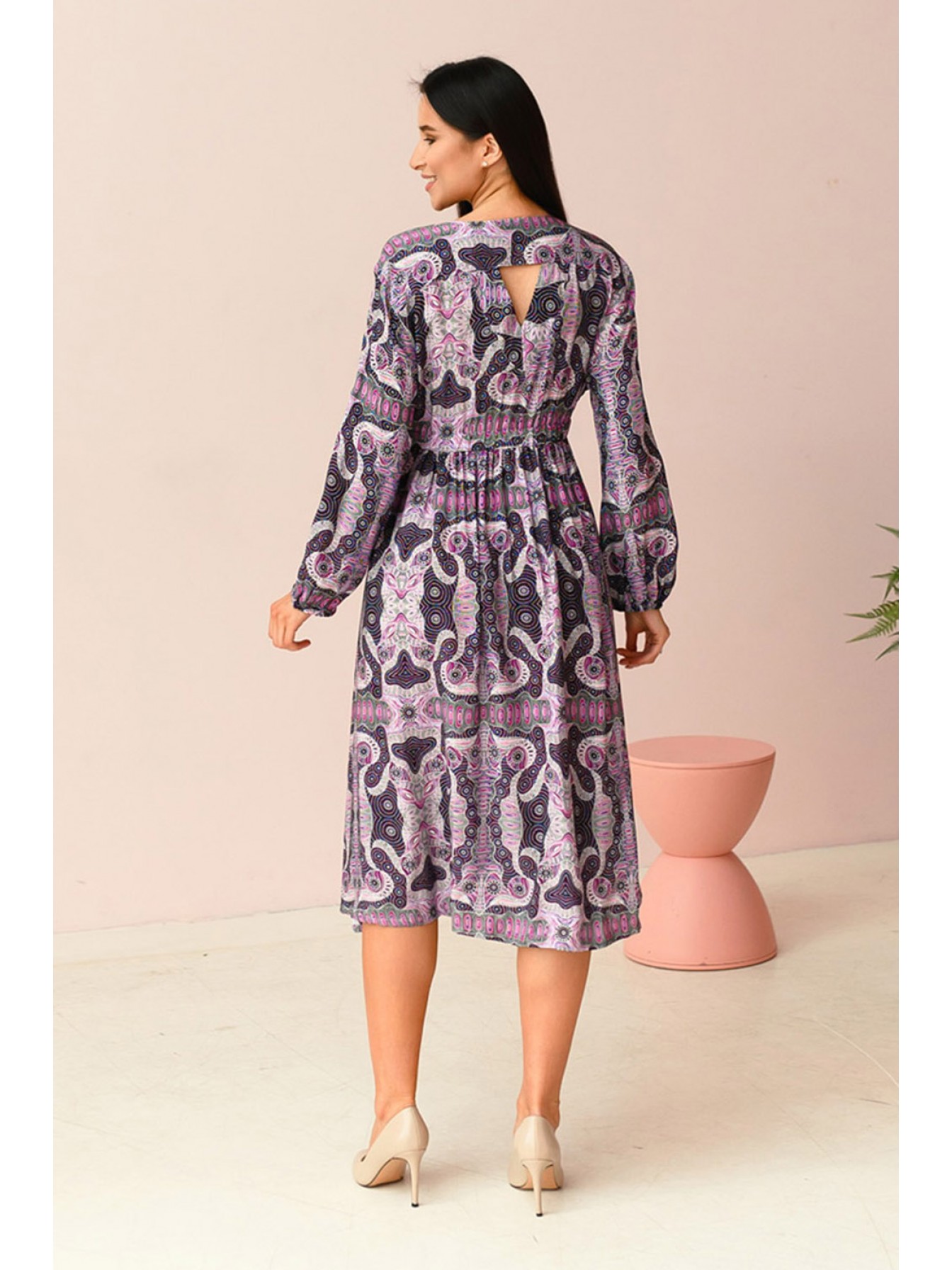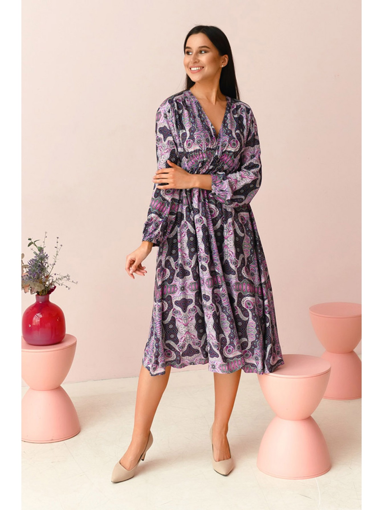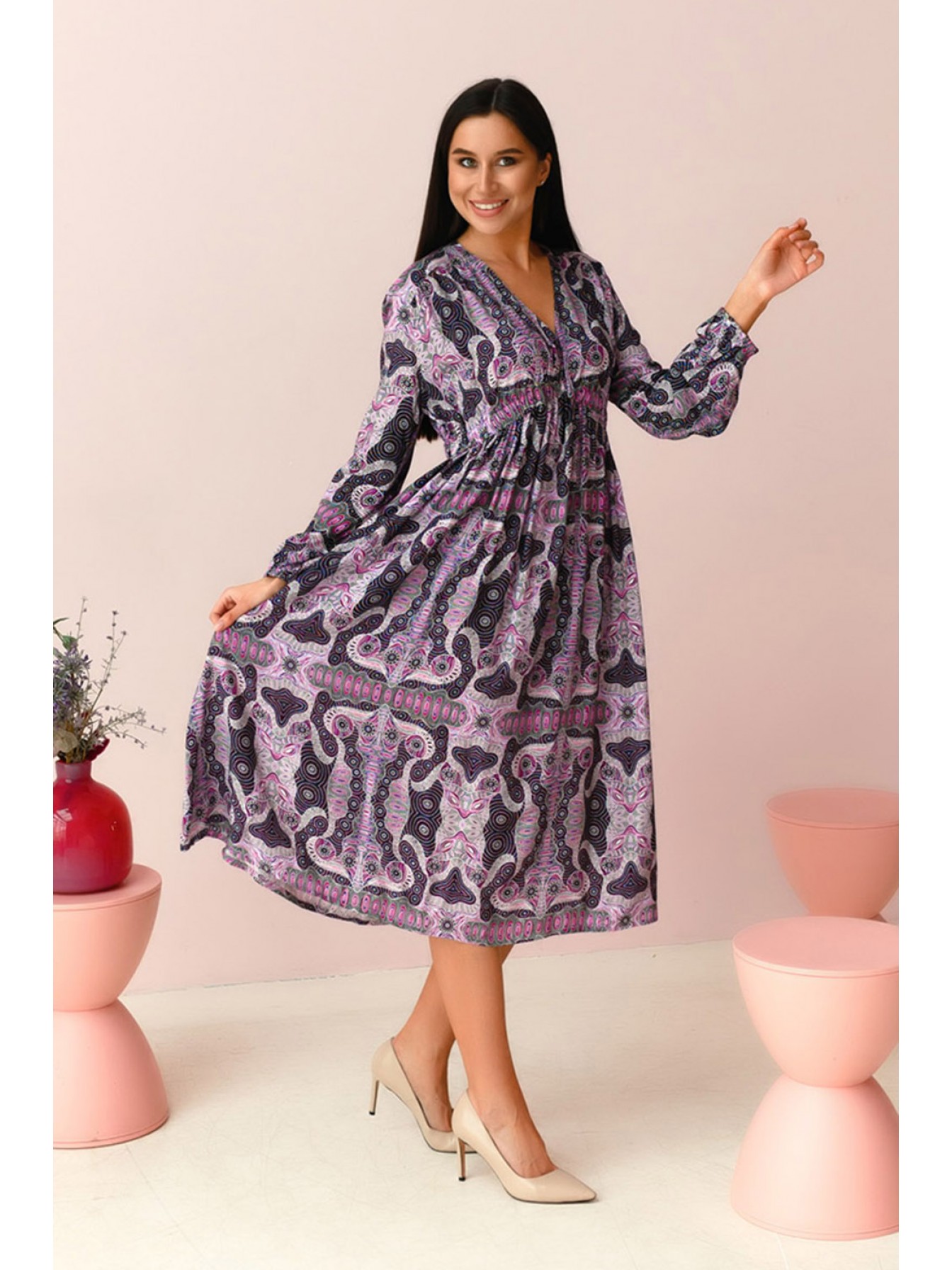 Длинное платье с завышенной линией талии, из принтованной вискозы. Лиф и юбка соединены эластичной тесьмой. V-образная горловина, обработана обтачкой. Кокетка на спинке, соединяет V-образный вырез, создает треугольный вид. Рукав длинный расширенный к низу, низ рукава на эластичной тесьме.