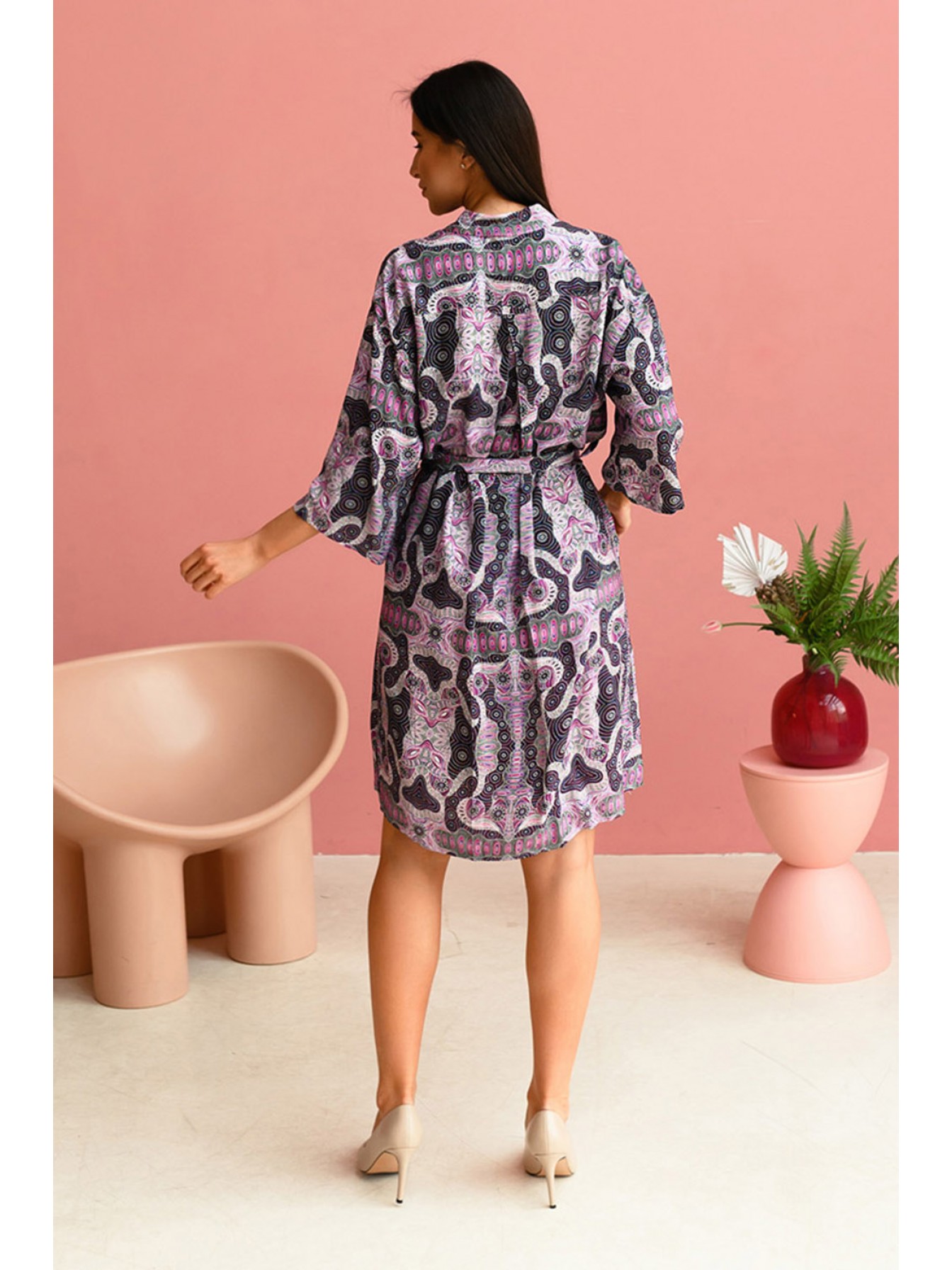 Платье - рубашка, прямое, длинное на поясе, из принтованной вискозы. Напоминает классическую мужскую рубашку. Отложной воротник со стойкой и застежкой планкой на пуговицах. Рукав прямой, 7/8, с застежкой платой. Заниженная линяя плеча, спущенный рукав, рубашечного кроя. Спинка с кокеткой и встречной складкой. Разрезы по боковым швам
