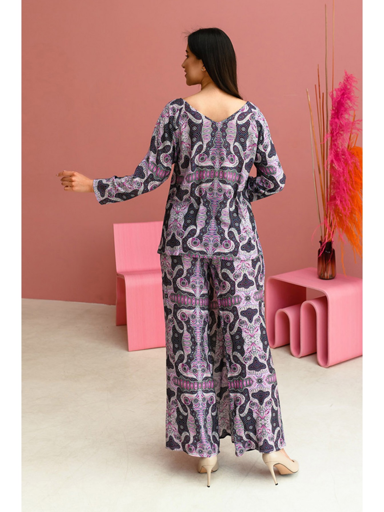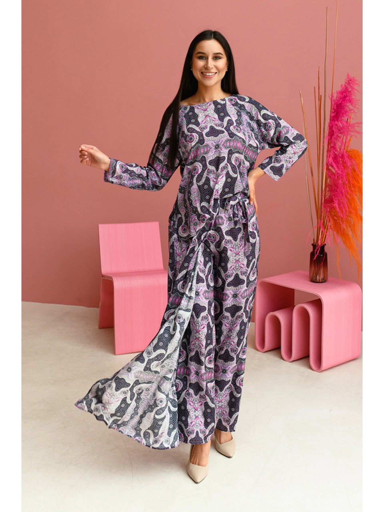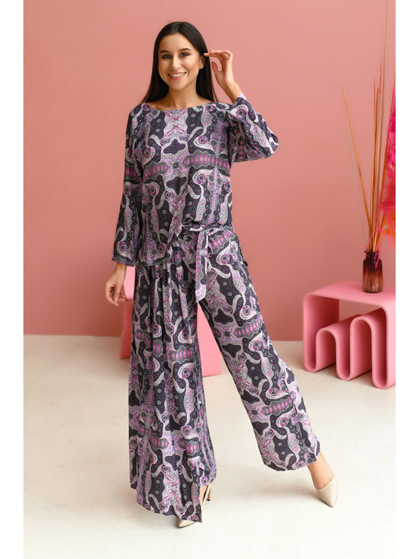 Комплект из туники и брюк с запахом, из принтованной вискозы. Туника средней длины прямого силуэта, рукав реглан. Горловина обработана обтачкой. Вырез горловины лодочка на полочке и V-образный на спинке. Удлиненная деталь спинки. Разрезы в боковых швах. Брюки с запахом, свободного силуэта. Отлетная деталь(, юбка), на поясе - завязке. Пояс на эластичной тесьме.