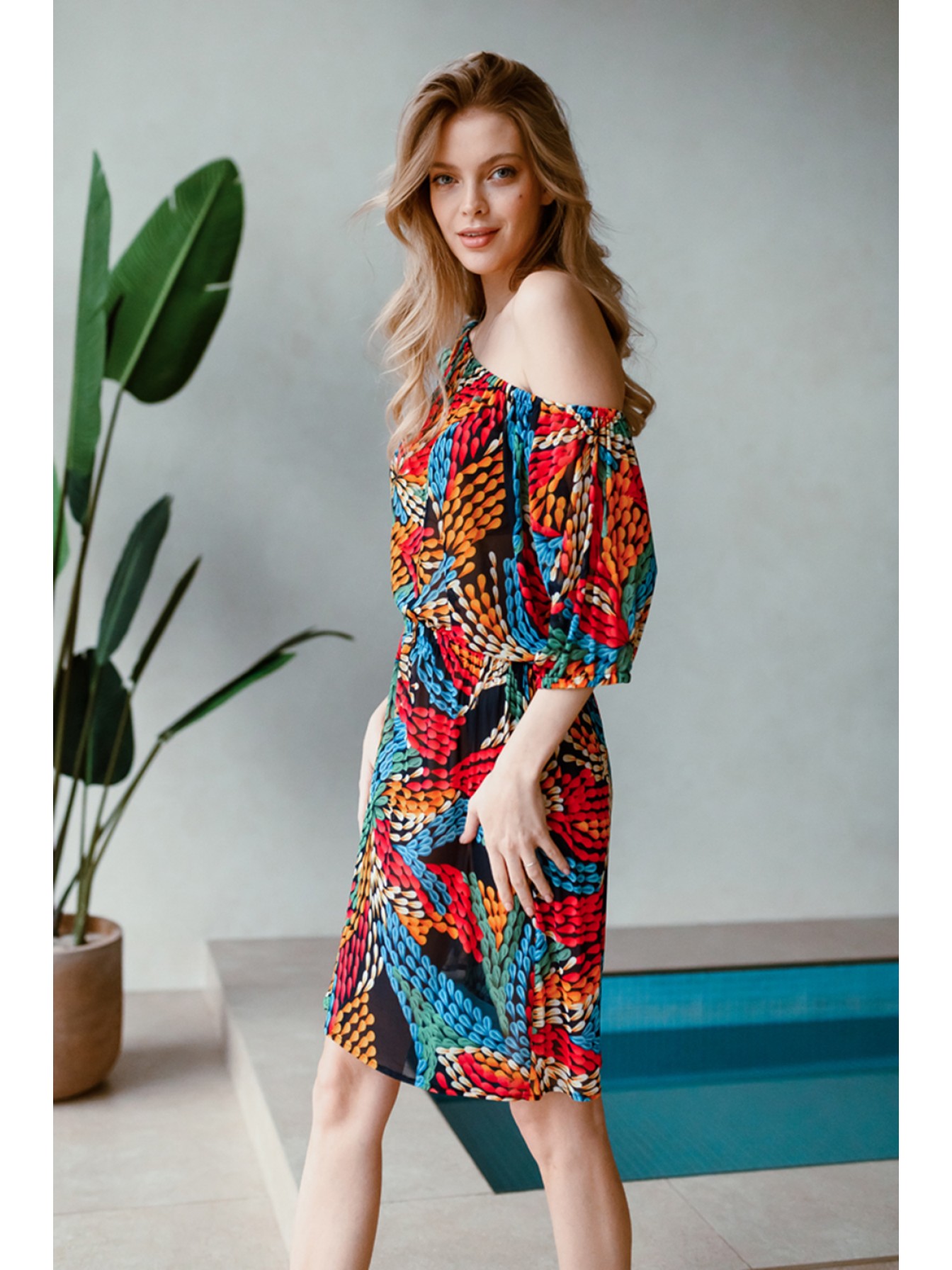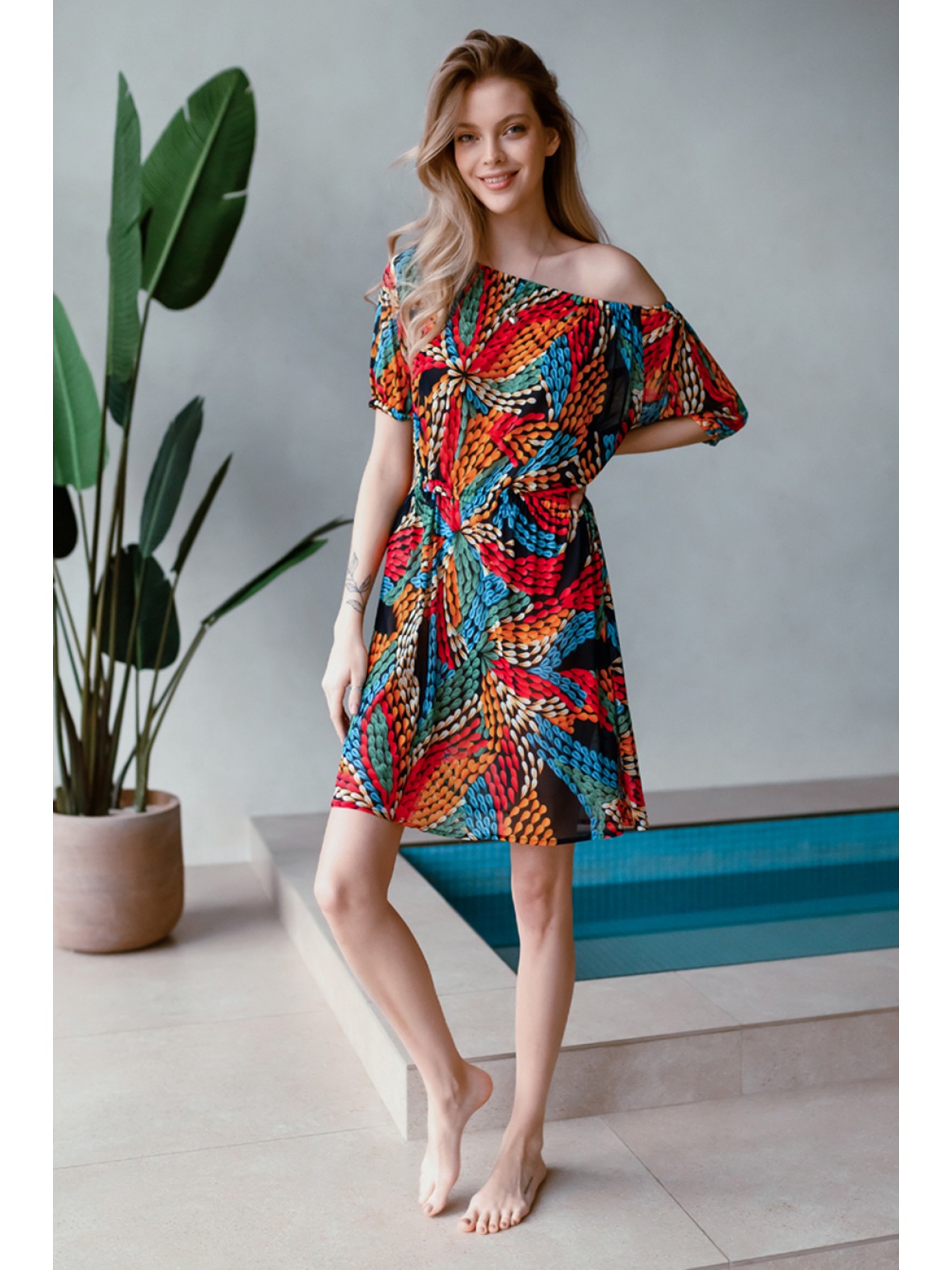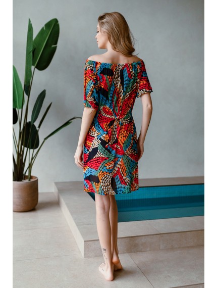 Туника домашняя женская выполнена из эластичной принтованной сетки. Модель приталенного силуэта длиной выше колена. По талии и по плечам изделия кулиска на резинке. Рукав короткий.