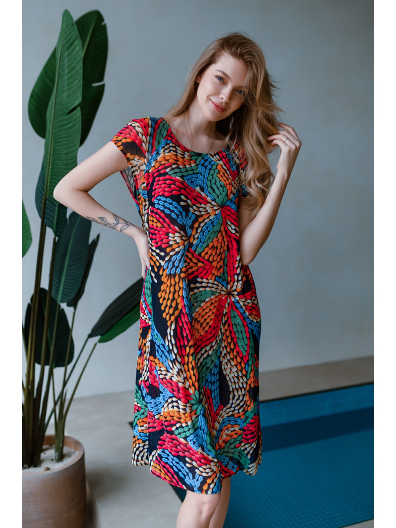 Туника женская средней длины выполнена из эластичной сетки с ярким принтом. Модель прямого силуэта с рельефами от проймы и рукавом реглан. Горловина спинки с разрезом капелька и завязкой из принтованной сетки для лучшей посадки по фигуре.