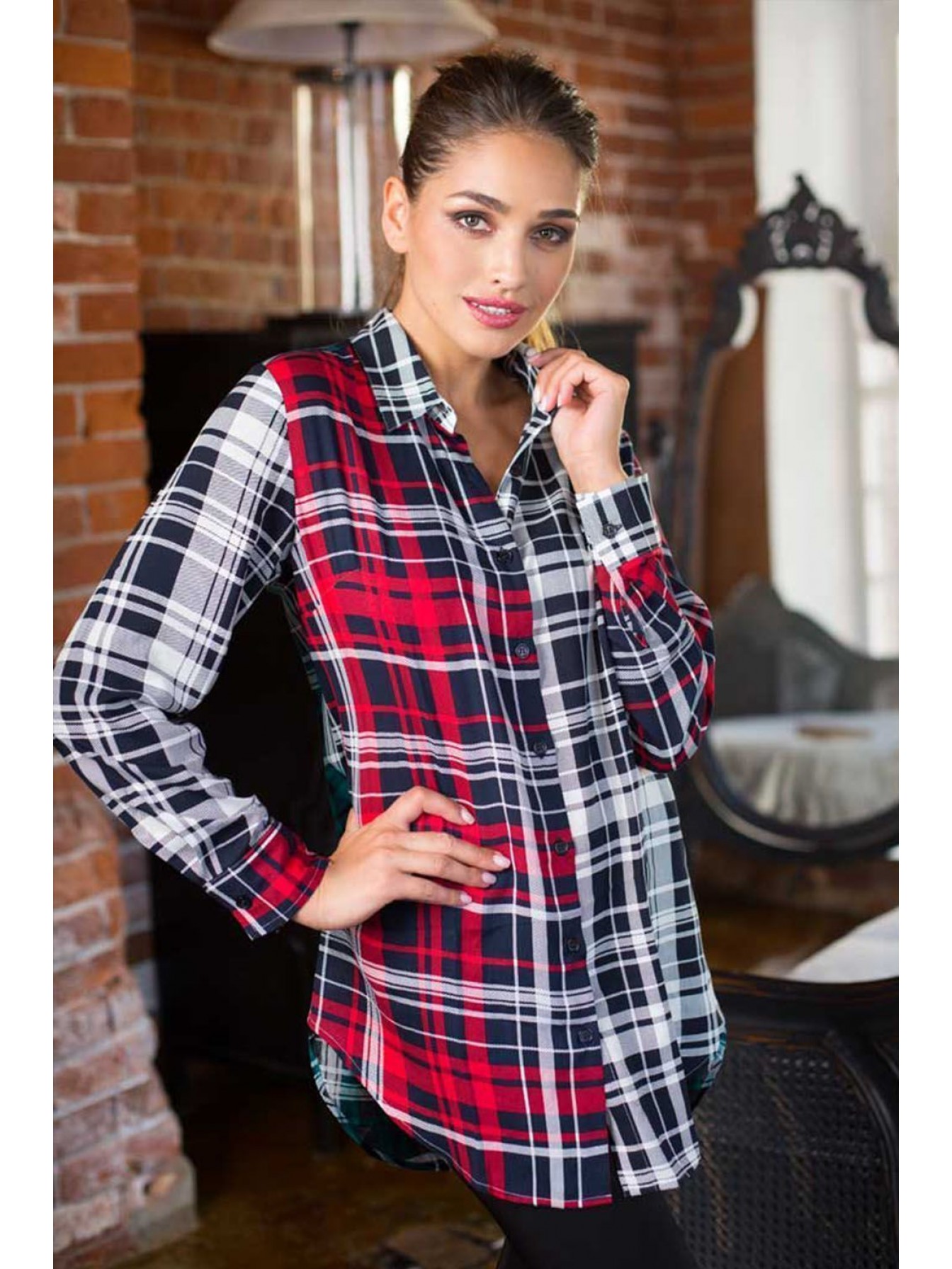 Туника Mia-Mia домашняя женская средней длины полуприлегающего силуэта из принтованной вискозы, с отложным воротником. Воротник рубашечного типа. Туника застегивается на пуговицы. На груди накладной карман с фирменной вышитой монограммой по ткани ручной работы.