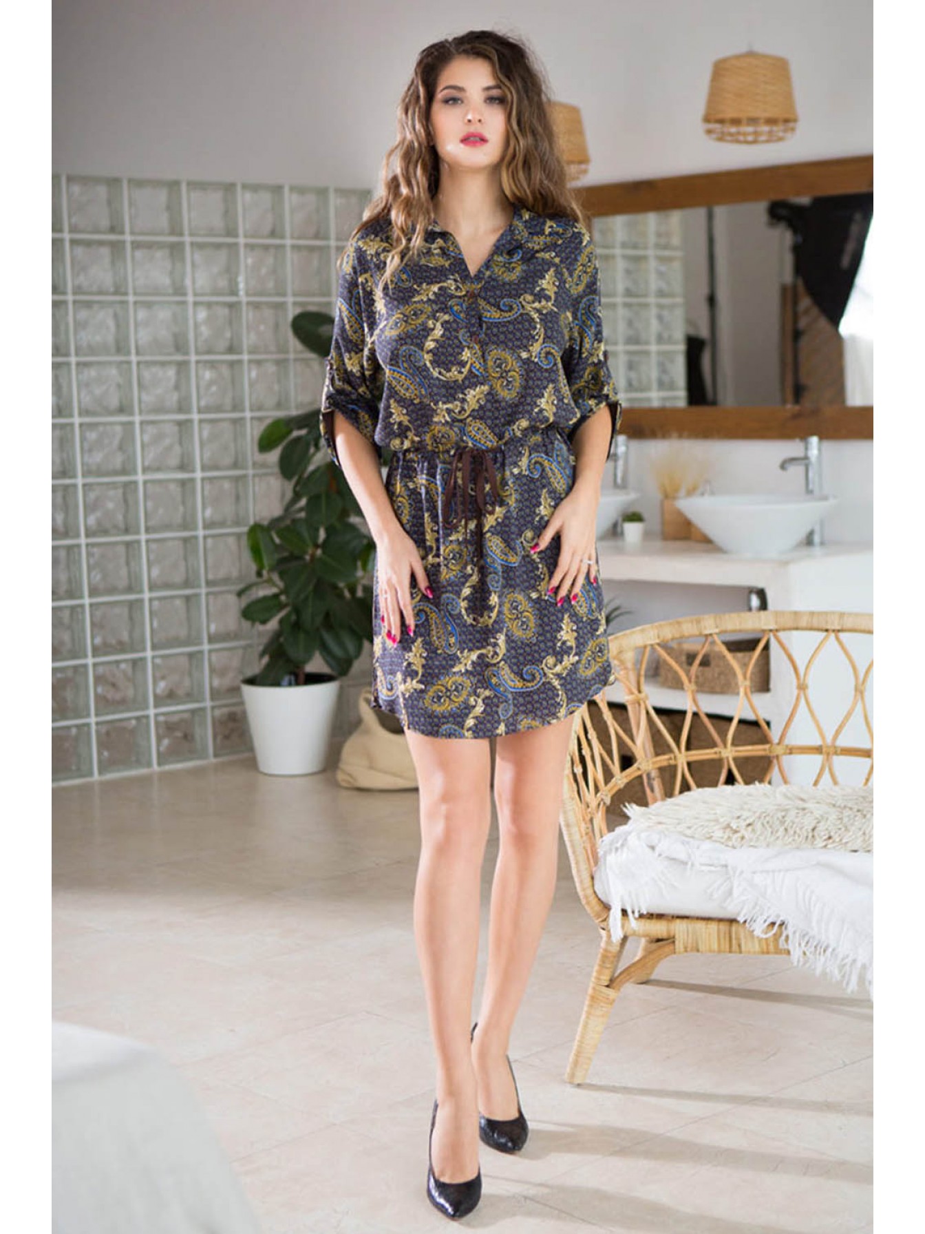 Туника домашняя женская выполнена из принтованной вискозы. Модель приталенного силуэта длиной выше колена. Рукав реглан, длиной 3/4, манжета двухсторонняя, на рукаве хлястик застегивающийся на пуговицы с петлей, для корректировки длины рукава. Туника с полукруглым низом и разрезами по бокам. Горловина полочки и спинки обработана втачным воротником на стойке с планкой на полочке, и с функциональной застежкой (, на петли и отделочные пуговицы), . По линии талии вшита кулиска.