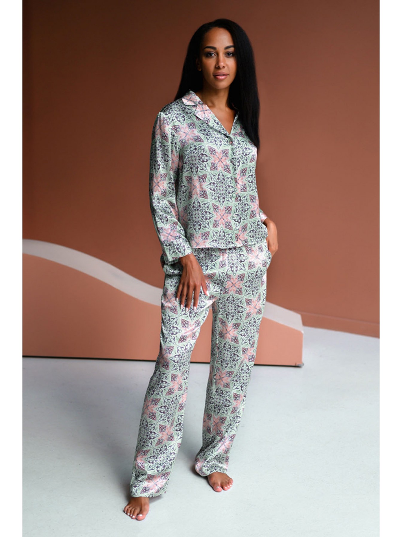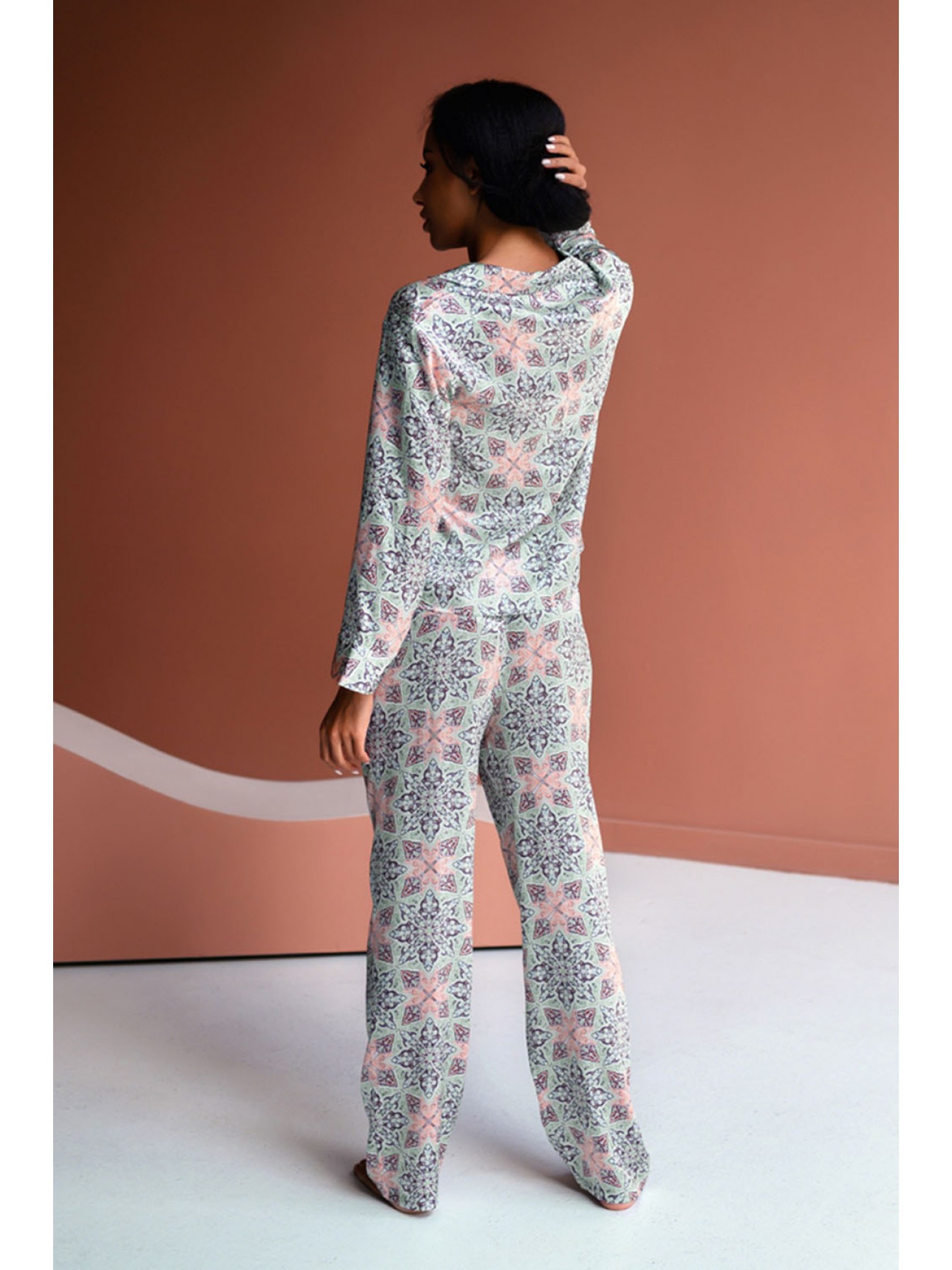 Комплект состоит из жакета и ,  , длинных брюк из натурального 100% шёлка с фантазийным принтом. Жакет полуприлегающего покроя с застежкой на ,  , пуговицы и отложным воротником. Втачной рукав на манжете. Длинные брюки свободного покроя ,  , на эластичной тесьме (, резинке), в поясе и с карманами в боковых швах.