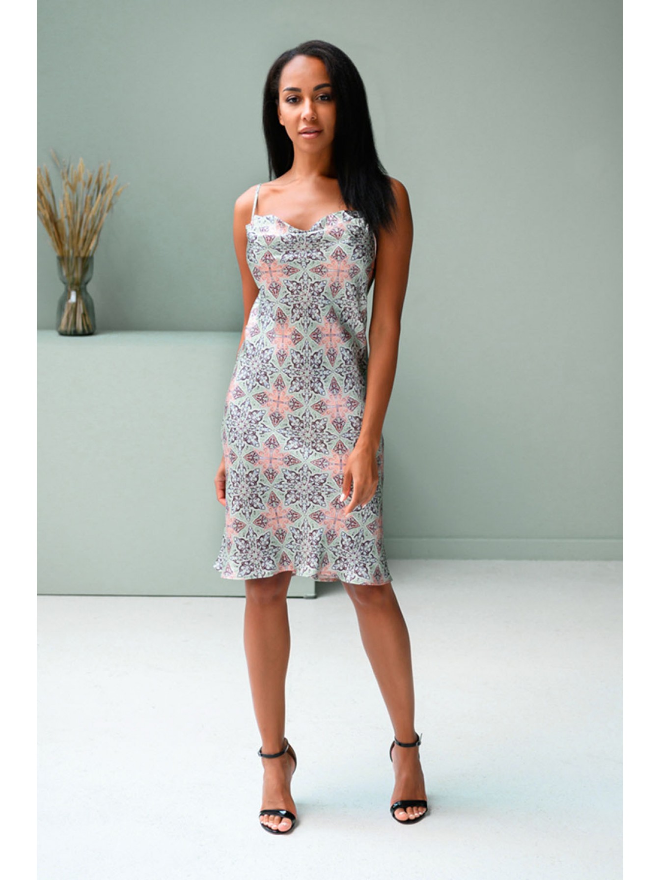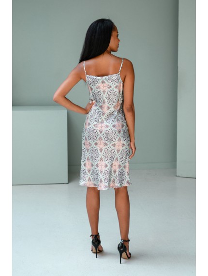 Платье средней длины (, до колен), полуприлегающего силуэта ,  , натурального 100% шёлка с фантазийным принтом, на тонких регулируемых бретелях. Изюминкой данной модели является драпировка по лифу.
