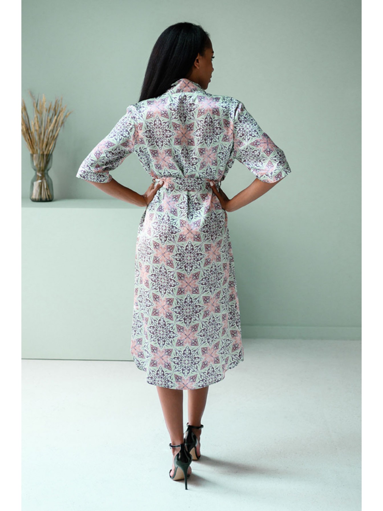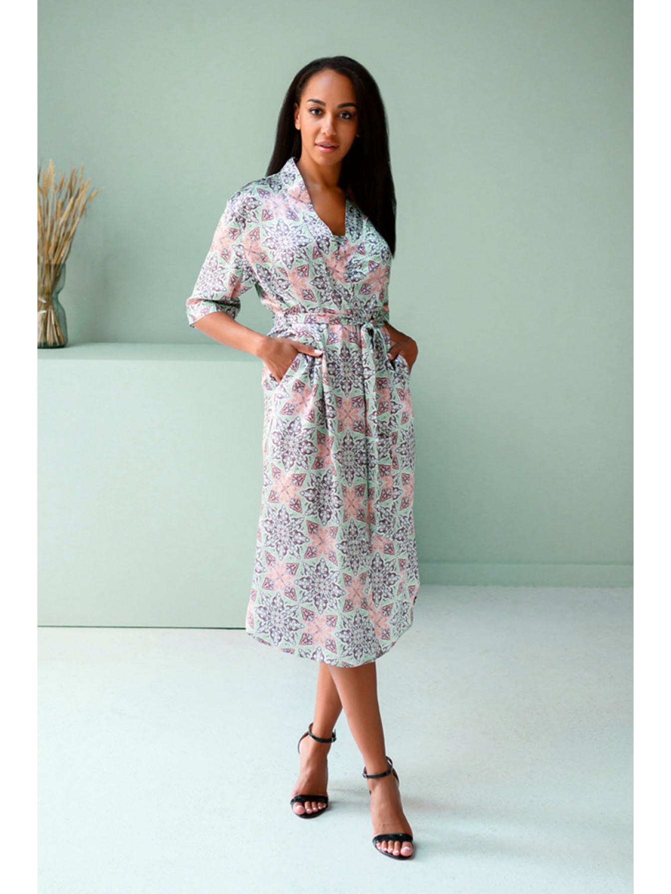 Длинный халат прямого силуэта выполнен из натурального 100% шёлка с фантазийным принтом, с втачным рукавом на манжете. Халат по борту на обтачке, по талии завязывается на пояс и внутреннюю завязку.