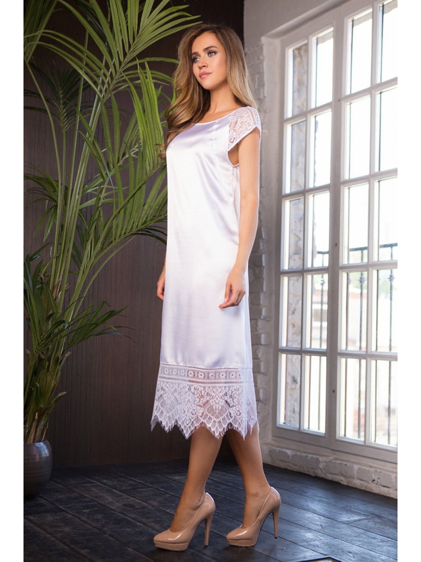 Женская длинная домашняя туника из однотонного сатина. Плечи и низ изделия декорированы тонким кружевом. На полочке имеются рельефы для улучшеной посадки по груди.