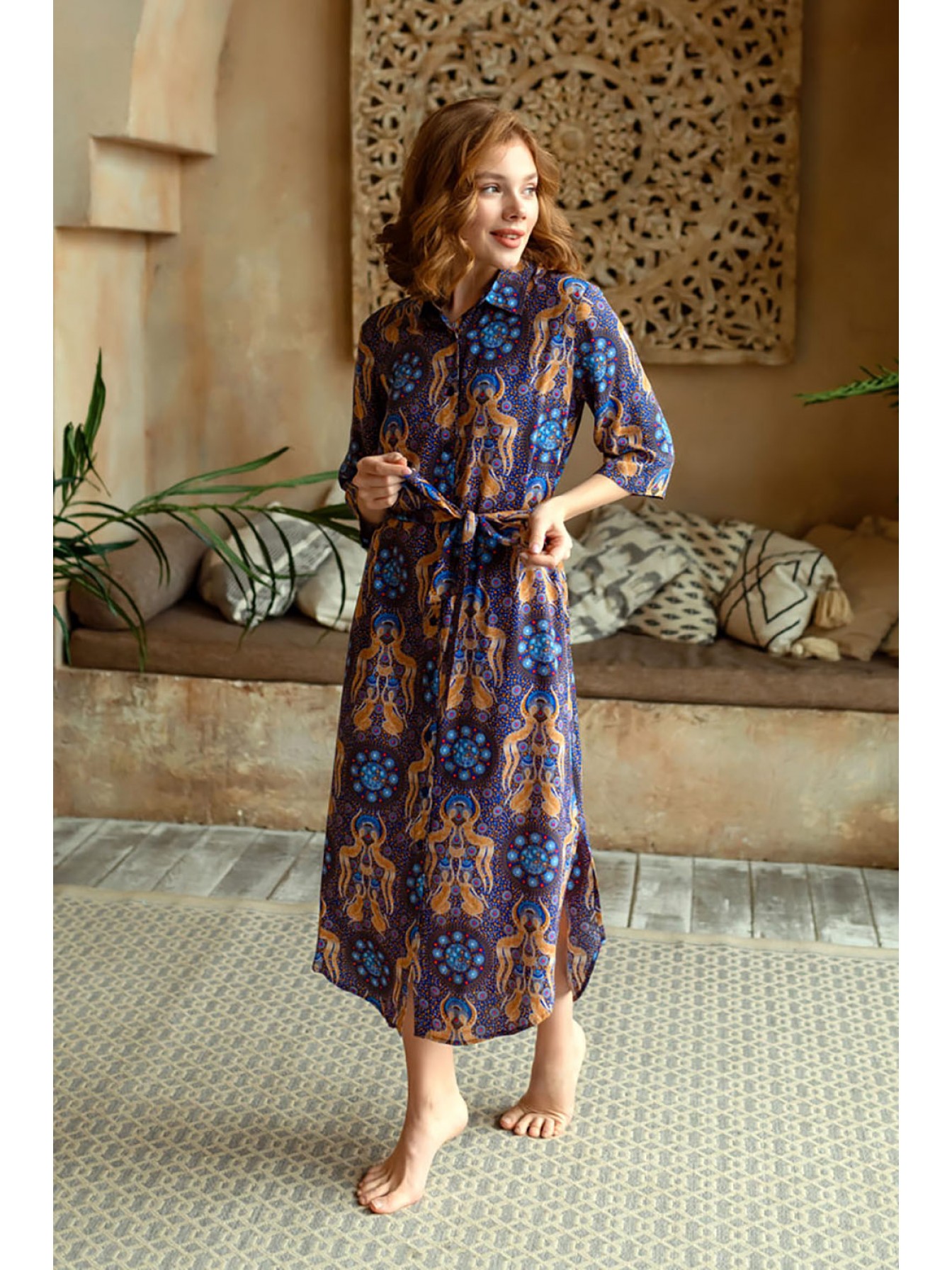 Платье домашнее женское выполнено из принтованной яркой вискозы. Модель на поясе свободногосилуэта длиной в пол. Рукав прямой длиной до локтя. Фигурный вырез горловины с обтачкой. В боковых швах карманы.