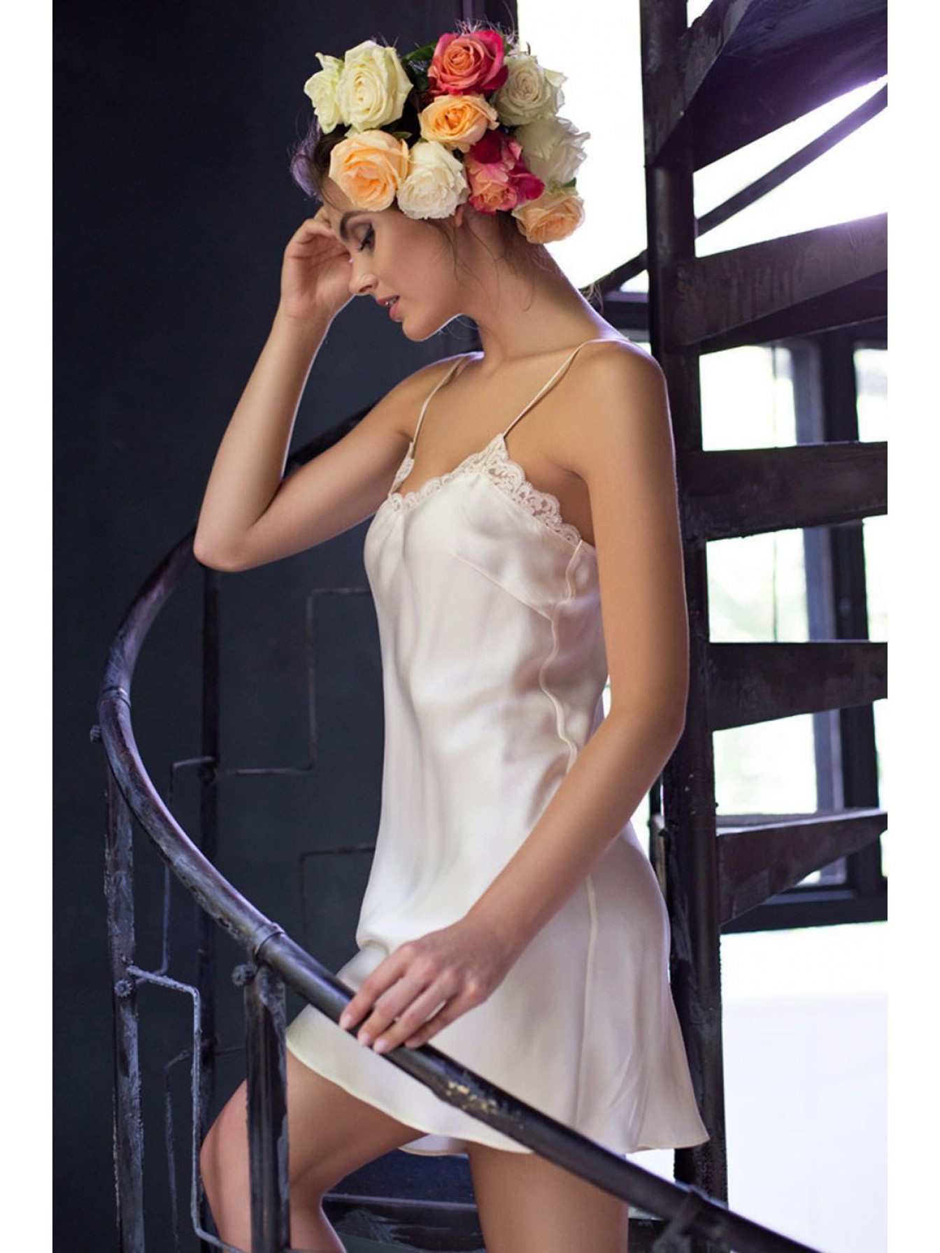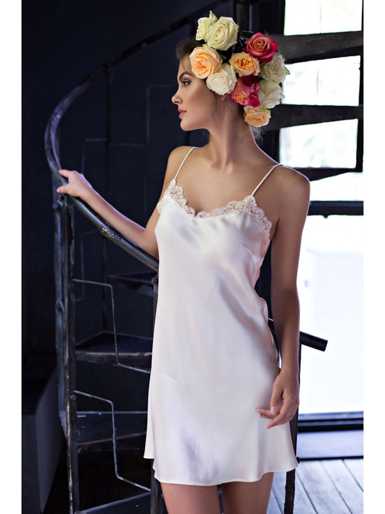 Короткая ночная сорочка полуприлегающего силуэта с V-образным вырезом на полочке из натурального шелка. Сорочка на тонких регулируемых бретелях, декорирована кружевом по лифу.