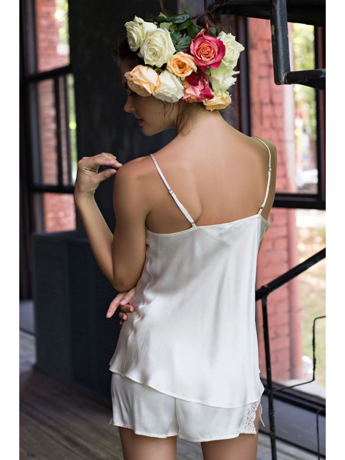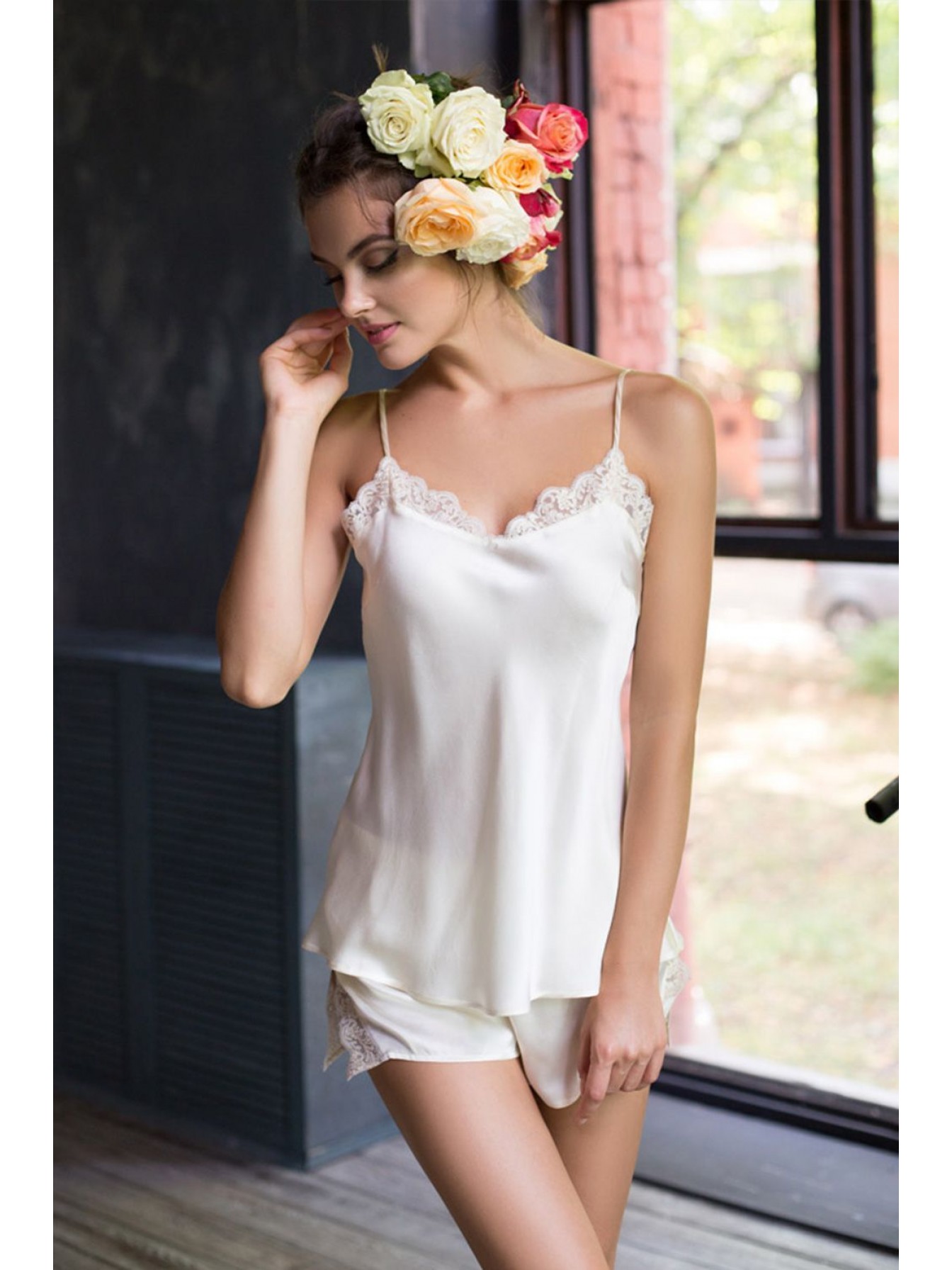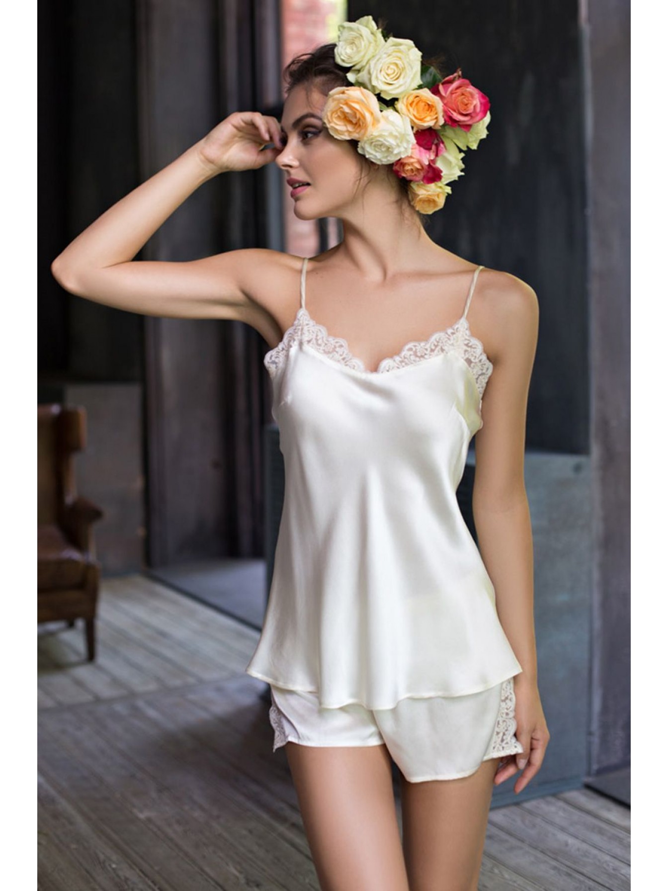 Комплект топ и шорты из натурального шелка. Топ с V-образным вырезом горловины полочки отланы кружевом. Топ на тонких регулируемых бретелях с вытачкой в пройме. Шорты на широком поясе-резинке, вставки по бокам с разрезами декорированы кружевом.