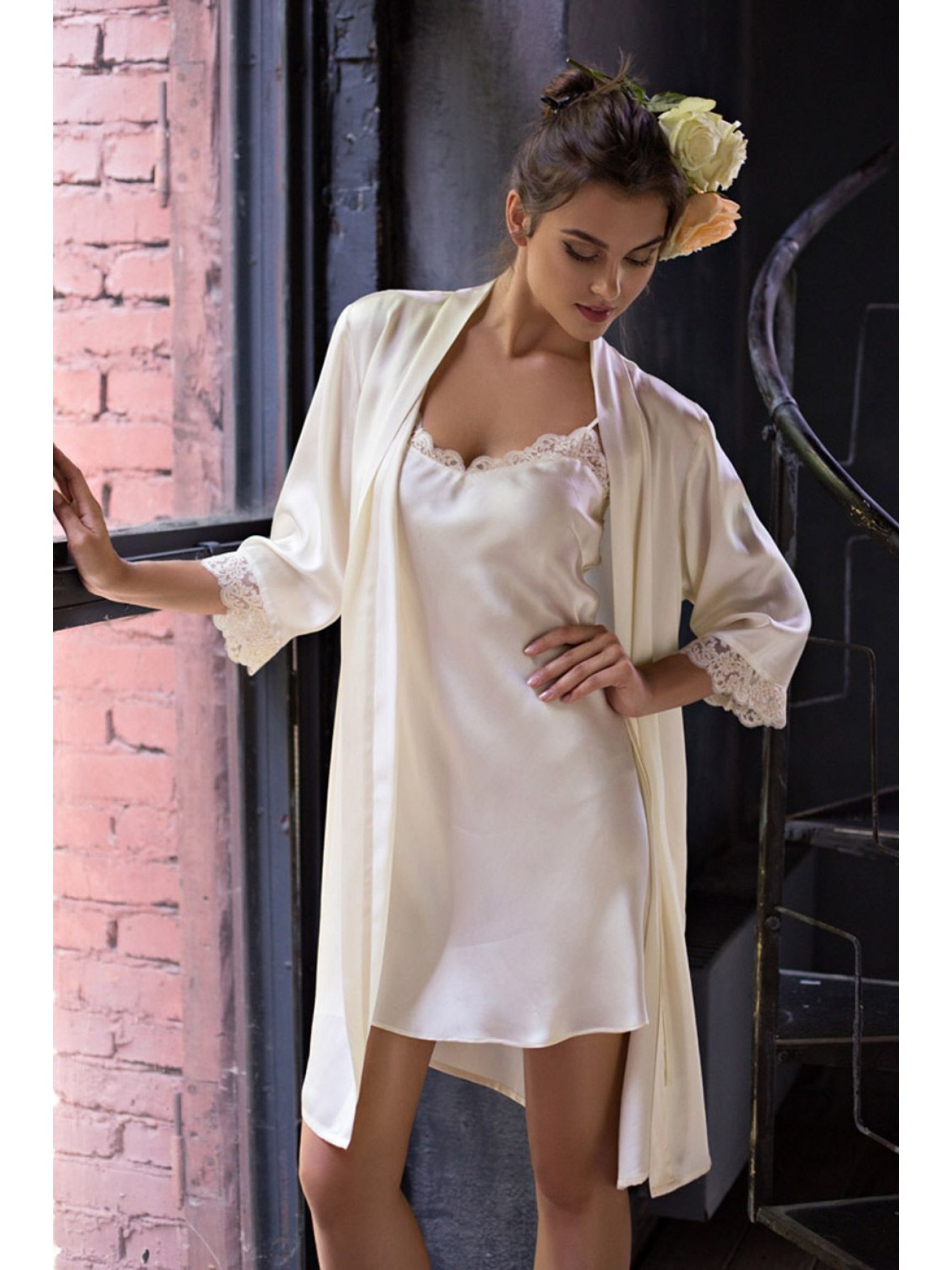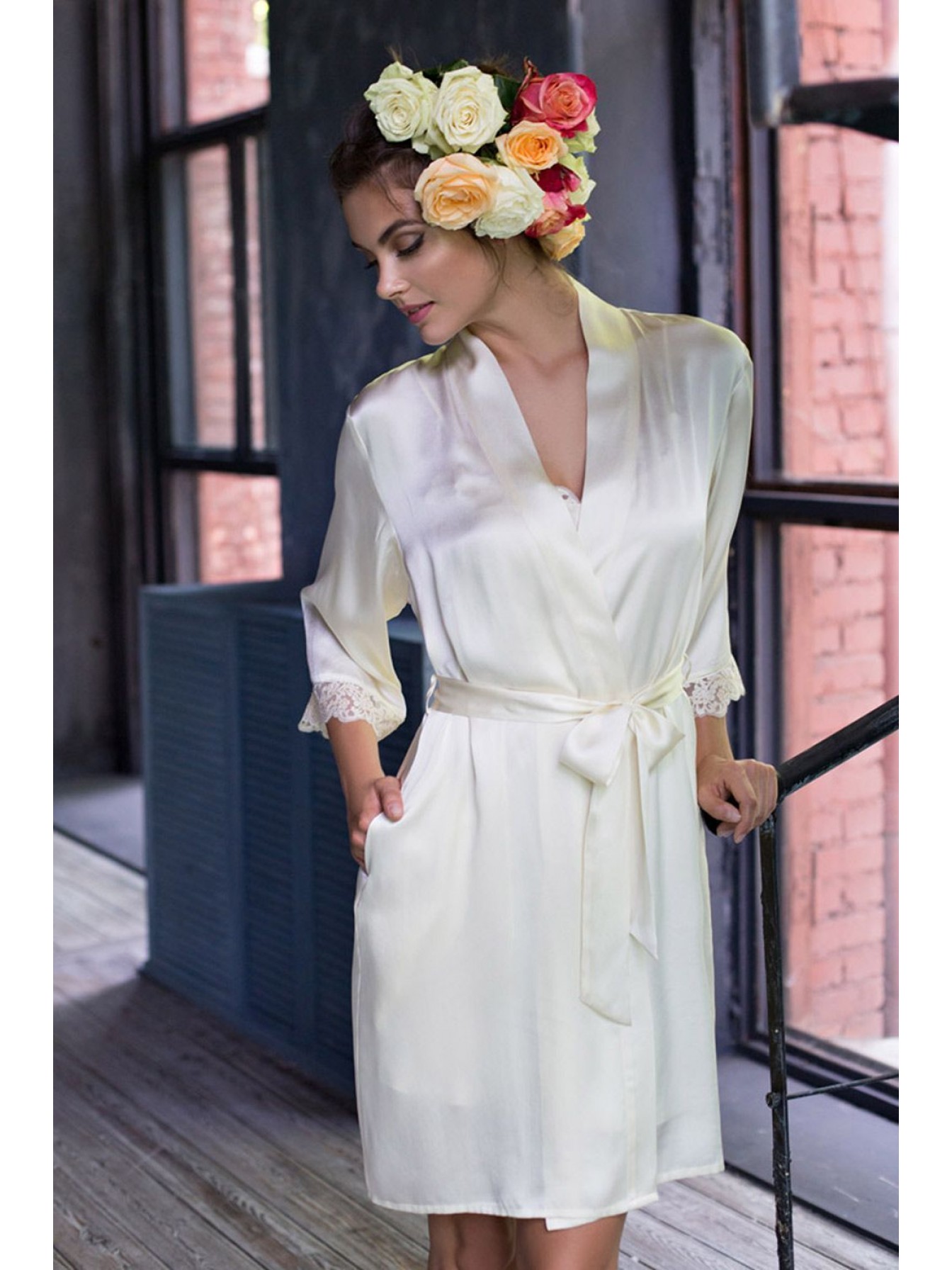 Короткий халат прямого силуэта выполнен из натурального шелка. Модель на поясе, с втачным рукавом на манжете, выполненный из кружевного полотна. Халат по борту на обтачке, на талии завязывается на внутреннюю завязку.