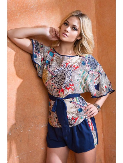Комплект состоящий из блузы и шорт на эластичной тесьме (, резинке), в поясе. Блуза выполнена из вискозы с фантазийным принтом. Модель с цельновыкроенными широкими рукавами и вырезом горловины лодочка. Горловина полочки и спинки, а так же низ рукавов окантованы однотонным кантом контрастного цвета. Шорты выполнены из однотонной вискозы с боковыми вставками из ткани с принтом, которые являются декором данной модели.