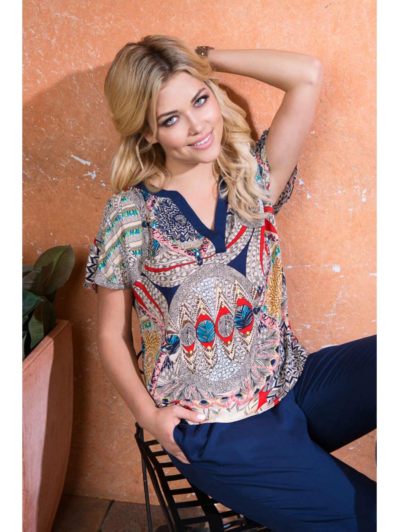 Великолепный комплект. Состоит из блузы и брюк. Блуза выполнена из вискозы с фантазийным принтом. Модель с цельновыкроенными короткими рукавами и фигурным низом. Круглый вырез горловины на полочке с V-образным разрезом, а также круглый вырез горловины спинки обработаны притачной обтачкой из однотонной вискозы, что является декором данной модели. По шву притачивания обтачки к горловине полочке и спинке заложена мягкая драпировка. Брюки с боковыми разрезами по низу и карманами в боковых швах, выполнены из однотоннй вискозы.