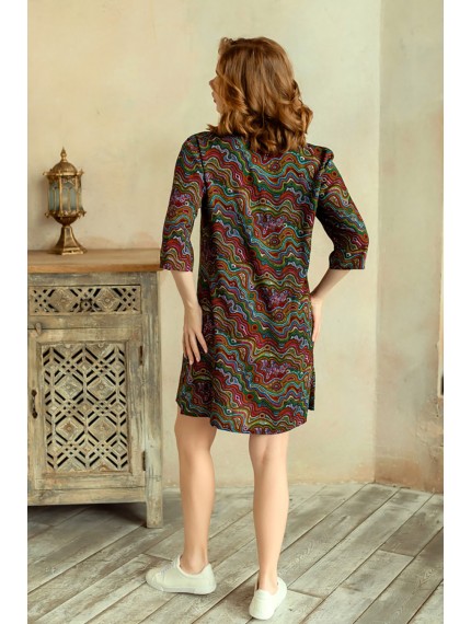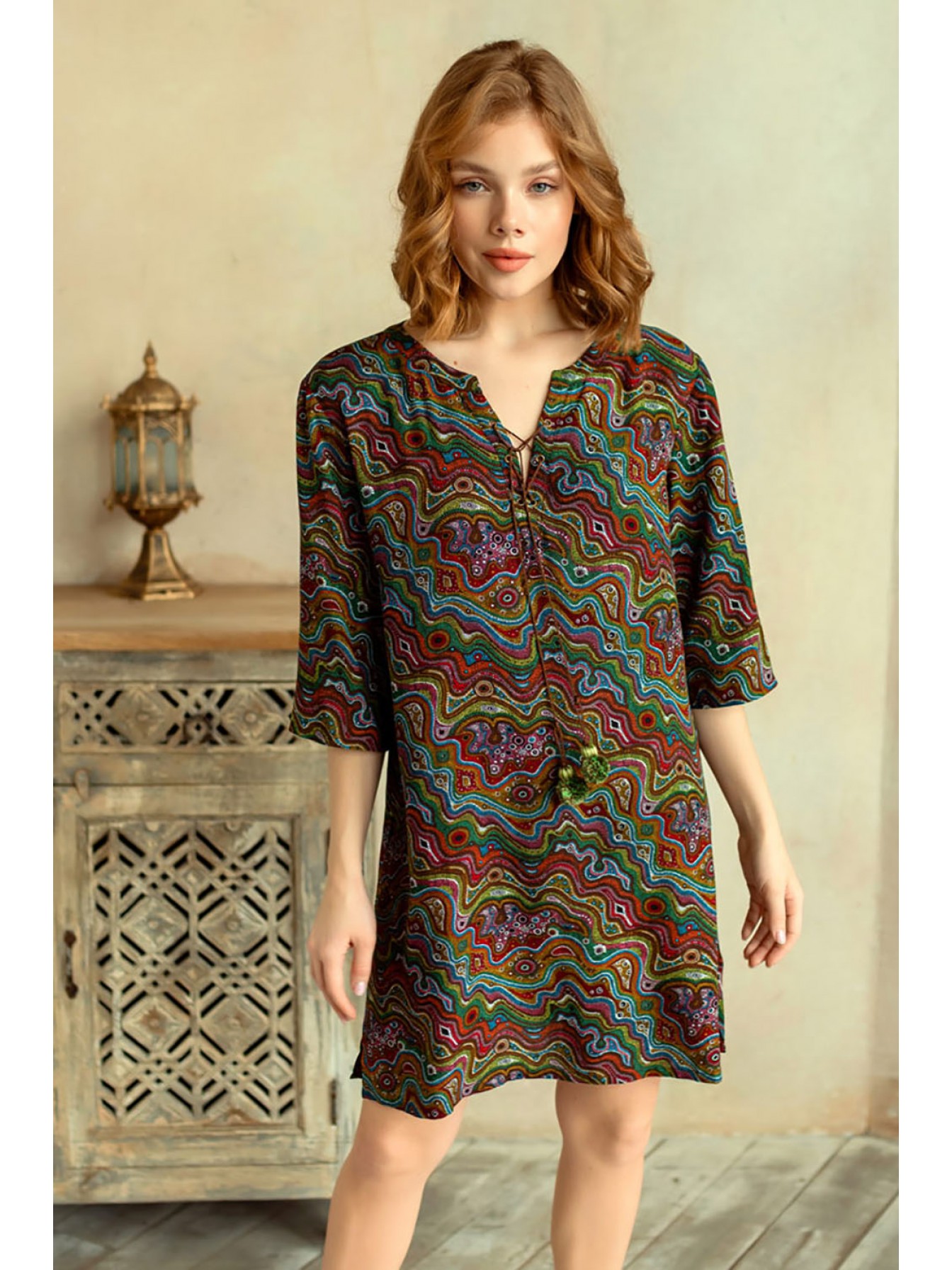 Туника средней длины прямого силуэта с круглым вырезом горловины на полочке и спинке из принтованной вискозы. Модель с втачными широкими рукавами и боковыми разрезами. Круглый вырез горловины полочки и спинки обработан притачной фигурной обтачкой. V-образный разрез на горловине полочки обработан притачной планкой. Планка туники декорирована тонким шнурком, который продергивается через люверсы.