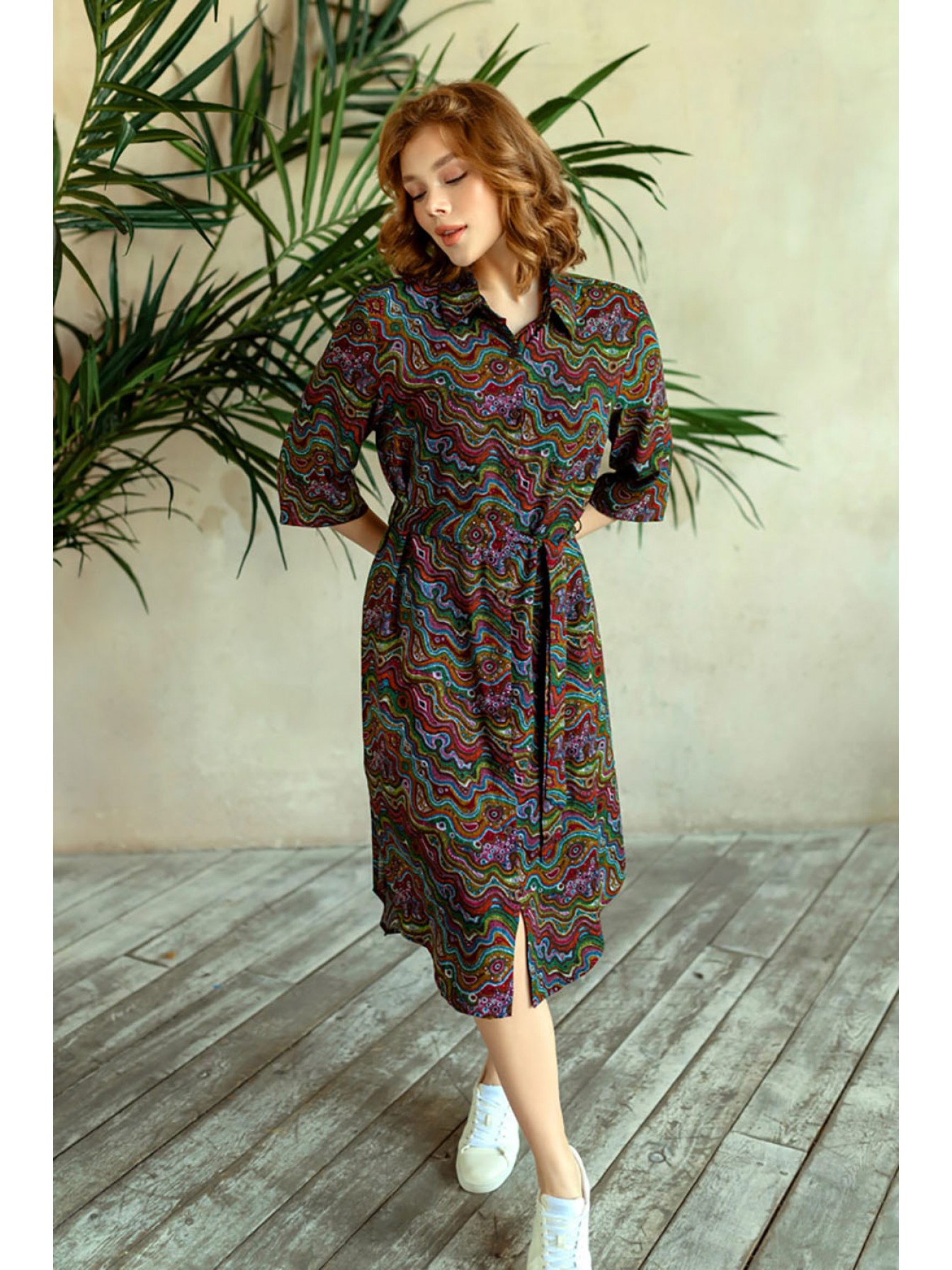 Туника домашяя женская выполненная из принтованной вискозы. Модель на поясе свободного силуэта длины миди. Туника рубашечного типа с воротником стойкой и планкой застежкой на пуговицах. Рукав прямой длиной 3/4.
