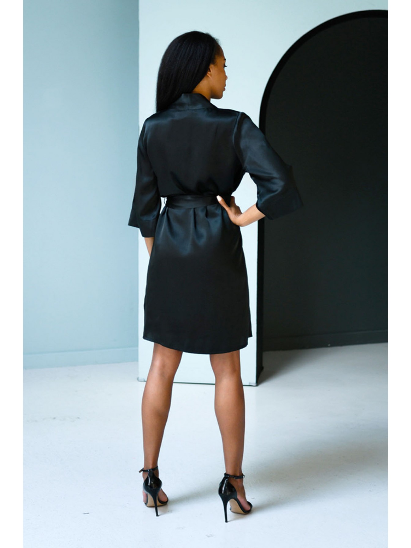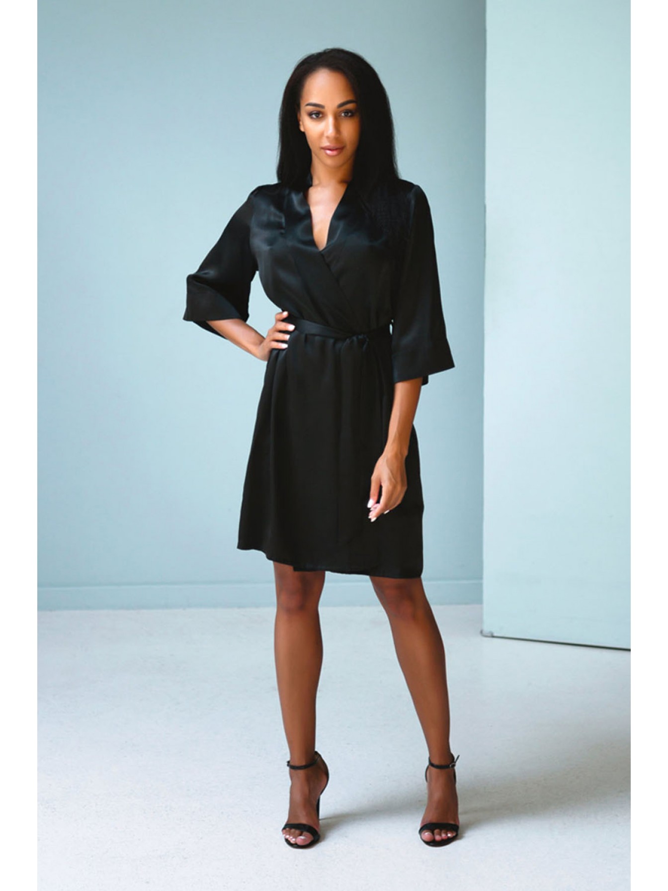 Халат прямого силуэта выполнен из натурального 100% шёлка. Халат на поясе, с втачным рукавом на широкой манжете. Модель по борту на обтачке, по талии завязывается на внутреннюю завязку.