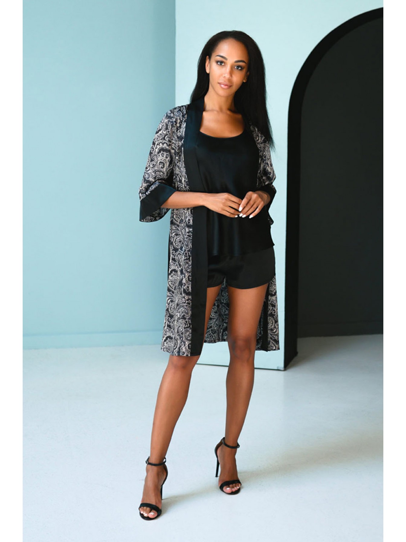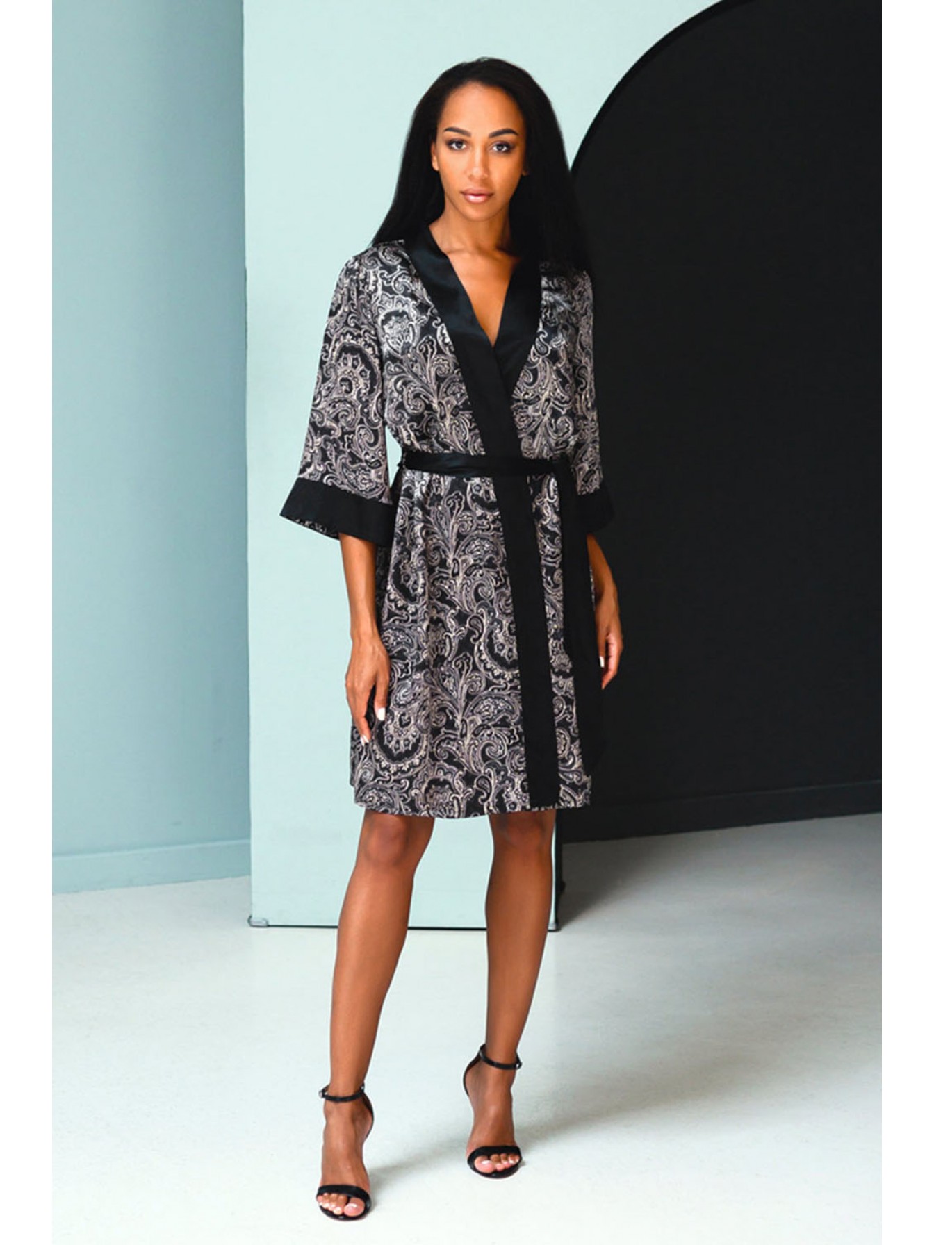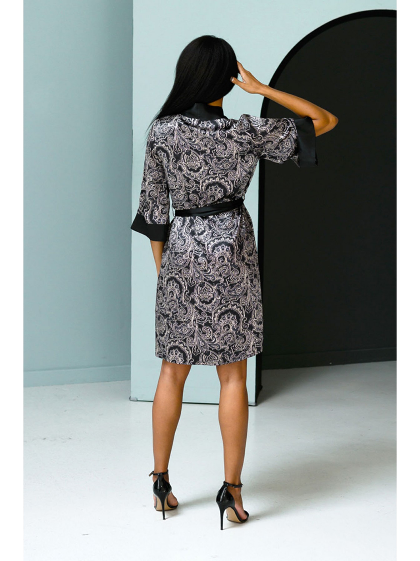Короткий халат прямого силуэта из натурального 100% шёлка с фантазийным принтом турецкий огурец на поясе. Халат с втачными рукавами на манжете. Модель по борту на обтачке, по талии завязывается на внутреннюю завязку.