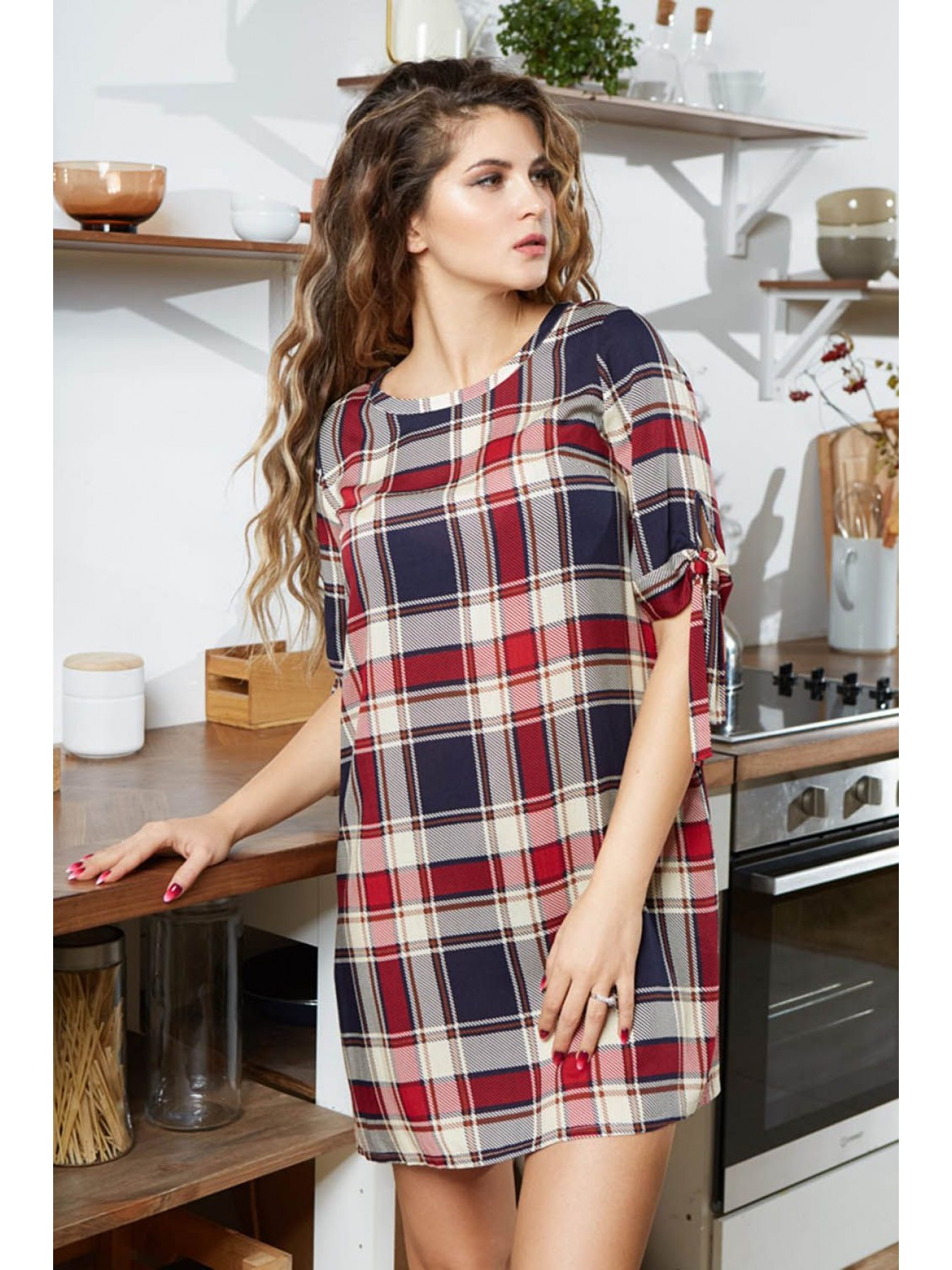 Туника домашняя женская выполнена из принтованной вискозы. Модель свободного силуэта длиной выше колена. Туника с рукавом до локтя, манжеты рукавов на завязках. Полукруглая горловина туники окантована обтачкой из вискозы.
